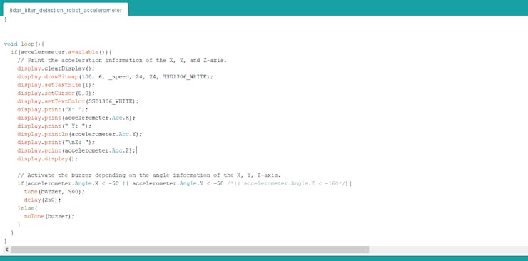 After completing the steps above, I decided to add a 6-axis accelerometer to the litter detection robot as a fall detection system to forfend it against crashes. The fall detection system also shows acceleration measurements of the X, Y, and Z-axis.