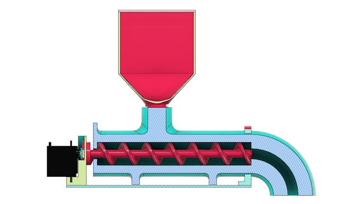 The feed will go down through the hole and will be transported to the exit through an Archimedes screw. Do you know how an Archimedes screw works?