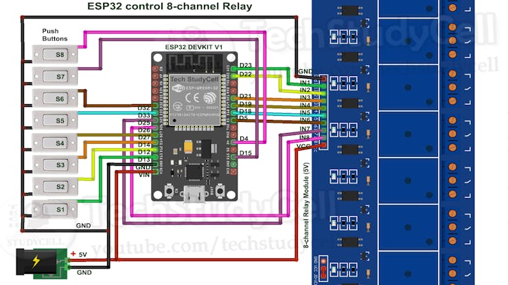 The circuit is very simple, I have used the GPIO pins D23, D22, D21, D19, D18, D5, D25 & D26 to control the 8 relays.