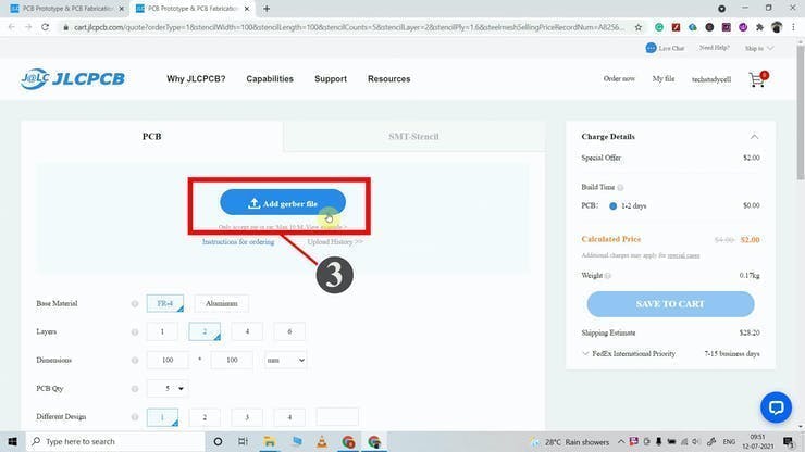 3. Click on the "Add gerber file" button. Then browse and select the Gerber file you have downloaded.