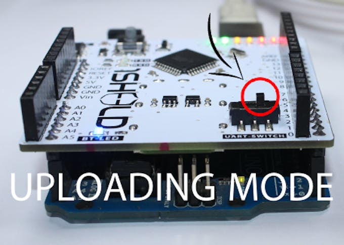 Upload mode is turned on when the UART switch is pushed away from the 1Sheeld logo.