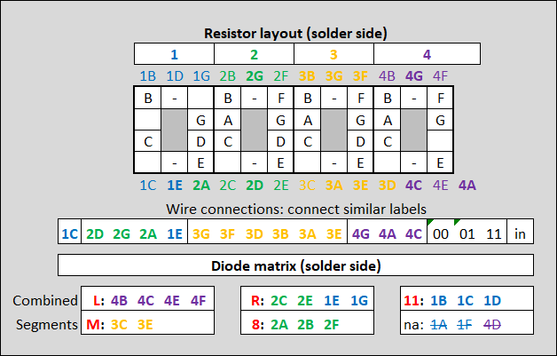 After that the tedious process of connecting the output of the diode matrix tot the several segments of the 7-segment displays. Since some diode signals need to light several segments, pins with the same colour need to be connected. Be sure that every segment has its own resistor!