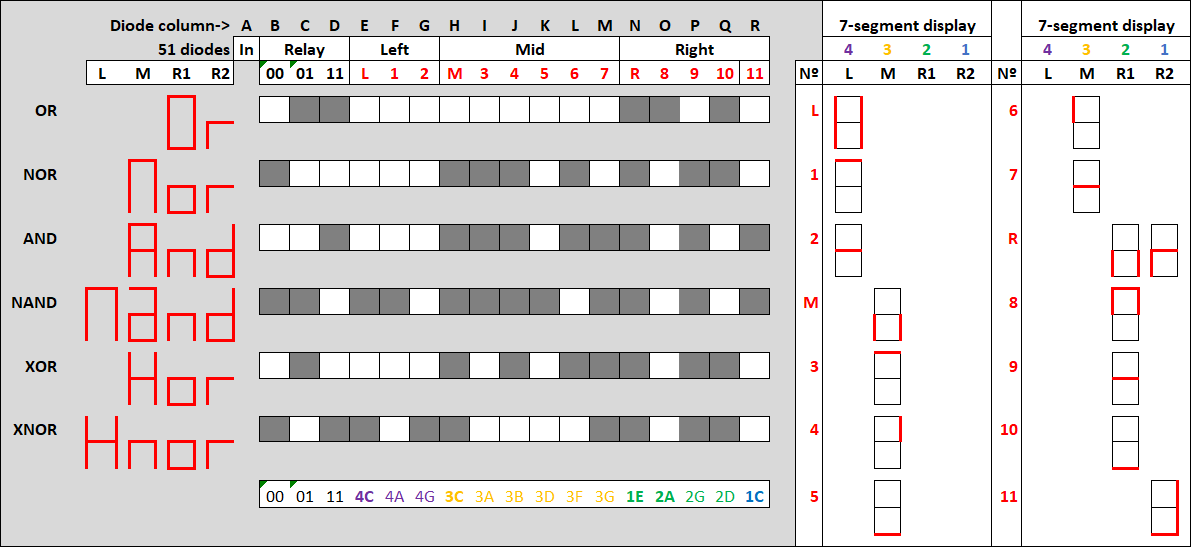 The leftmost three columns in the diode matrix are used for the gate logic. The other columns display the characters on the 7-segment displays.