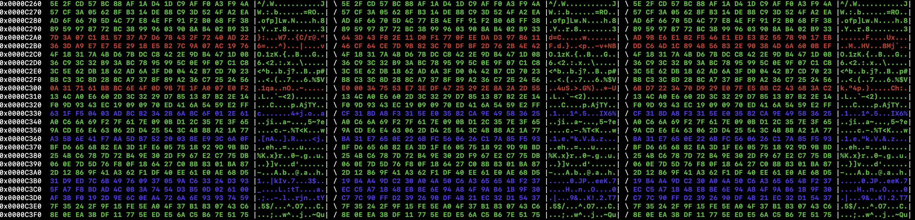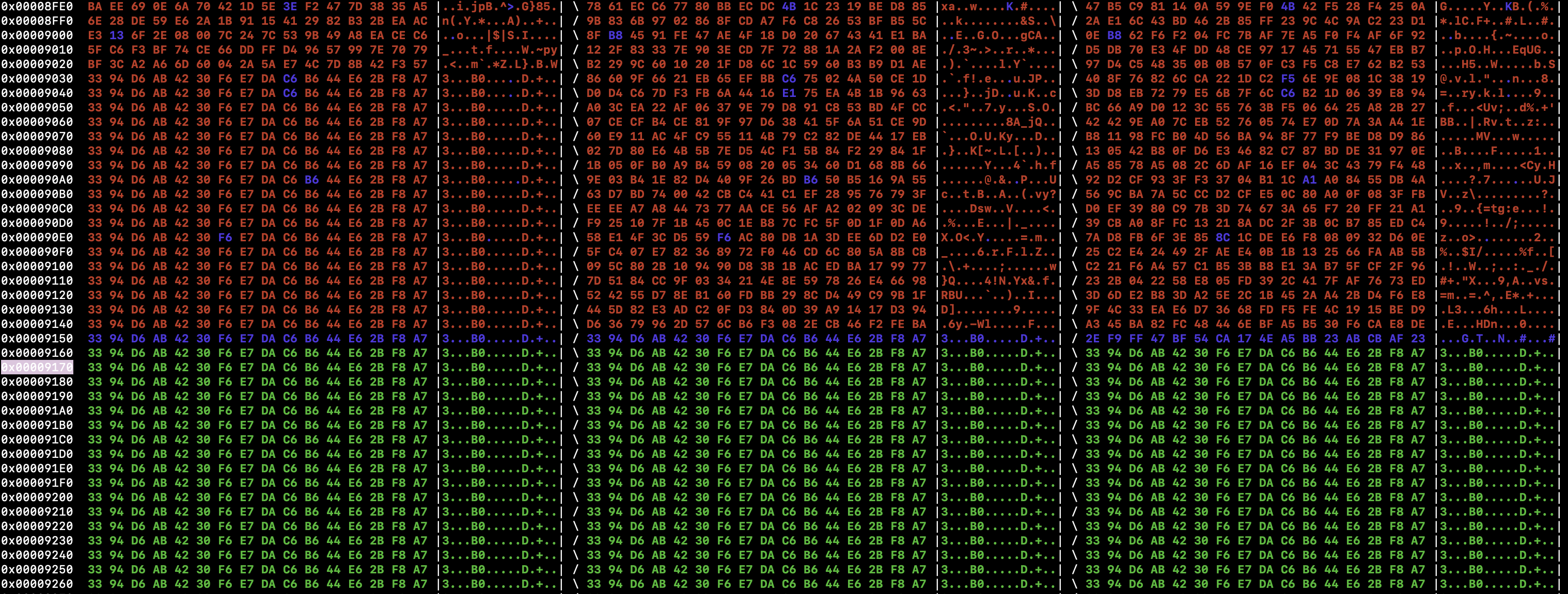 No lets take a look at the repetition of the sequence [33 94 D6 ... 2B F8 A7]. Its length is exactly 16 bytes. So whatever has happened with the firmware seems to be done in blocks of 16 bytes. A random sequence of the code (shown below) is showing that a change always affects a block of 16 bytes.