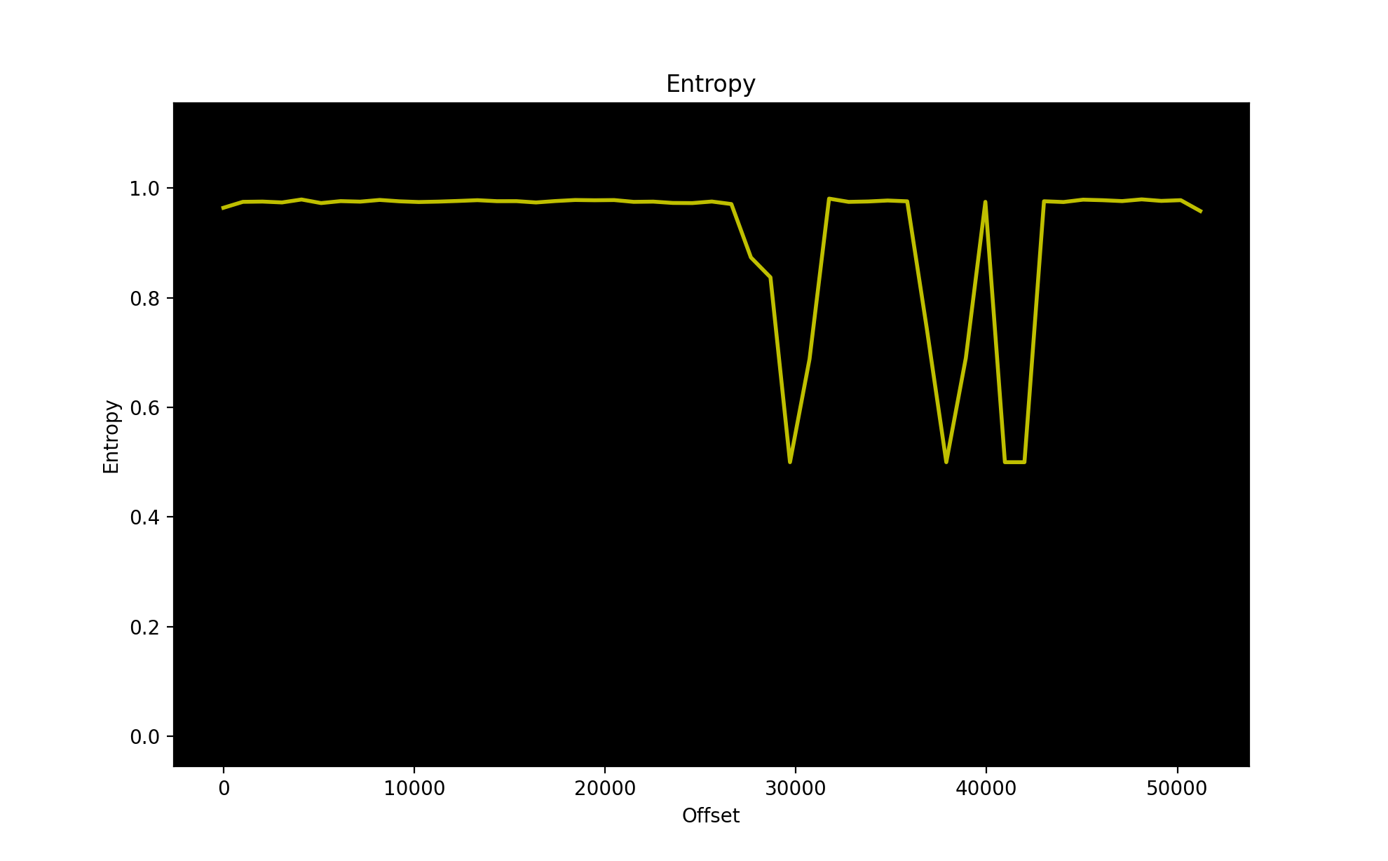 -$ ent TC66_V1.17.bin Entropy = 7.850424 bits per byte. Optimum compression would reduce the size of this 51840 byte file by 1 percent. Chi square distribution for 51840 samples is 16149.98, and randomly would exceed this value less than 0.01 percent of the times. Arithmetic mean value of data bytes is 131.9124 (127.5 = random). Monte Carlo value for Pi is 3.055092593 (error 2.75 percent). Serial correlation coefficient is -0.004224 (totally uncorrelated = 0.0).