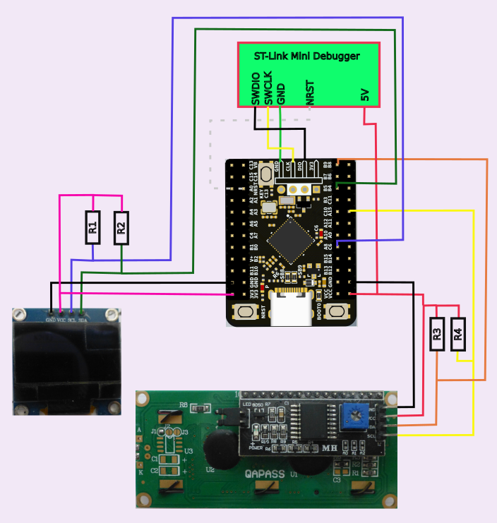 Component Component Pin WeActDuino Pin Comment ST-Link Mini Debugger SWDIO DIO 4 Pin Header ST-Link Mini Debugger SWCLK CLK 4 Pin Header ST-Link Mini Debugger GND GND 4 Pin Header ST-Link Mini Debugger NRST NRST ST-Link Mini Debugger 5V Vcc 128x64 Display Vcc 3.3V 128x64 Display SCK A8 (SCL3,D21) 1.8K to 3.3V pullup 128x64 Display SDA B5 (SDA3,D31) 1.8K to 3.3V pullup 128x64 Display GND GND HD44784 Display Vcc 5V HD44784 Display SCK A15 (SCL1,D28) 5.1K to 5V pullup HD44784 Display SDA B9 (SDA1,D35) 5.1K to 5V pullup HD44784 Display GND GND ![]()
