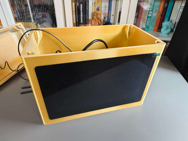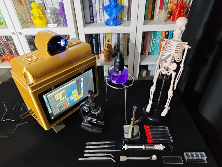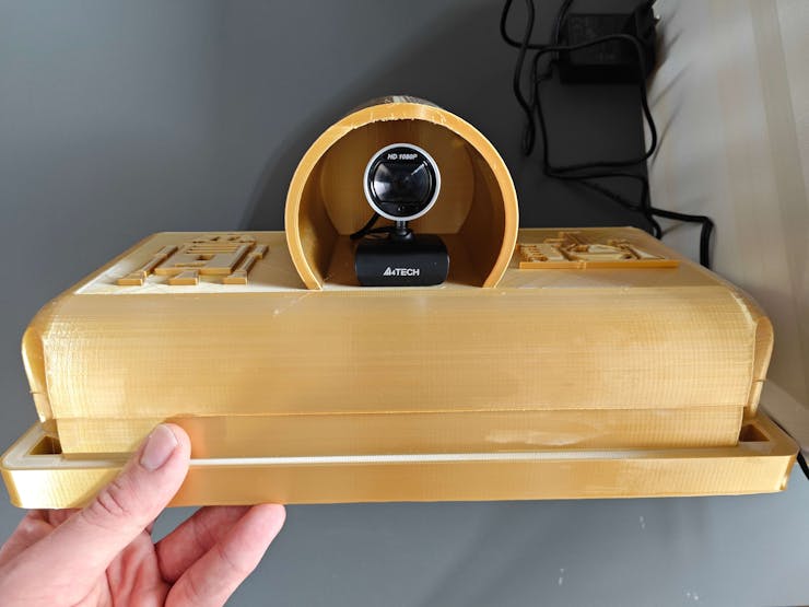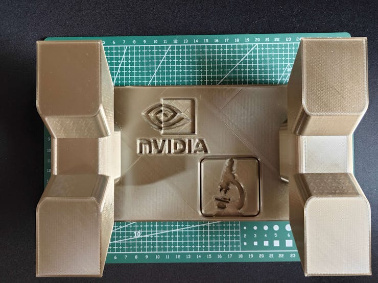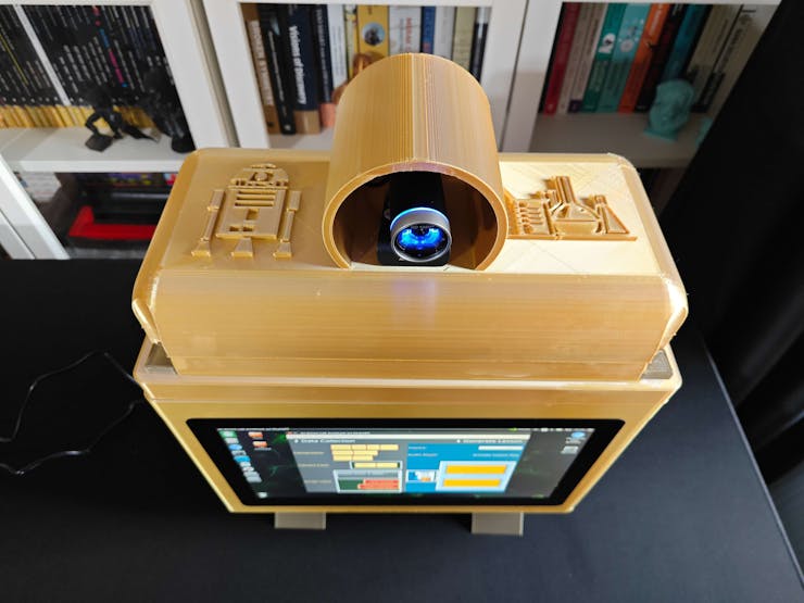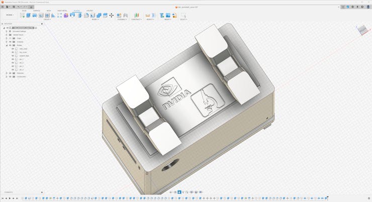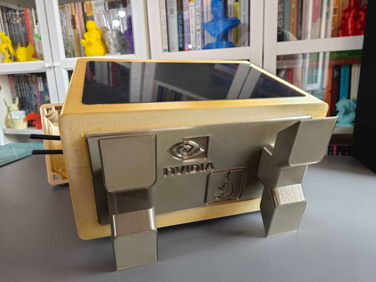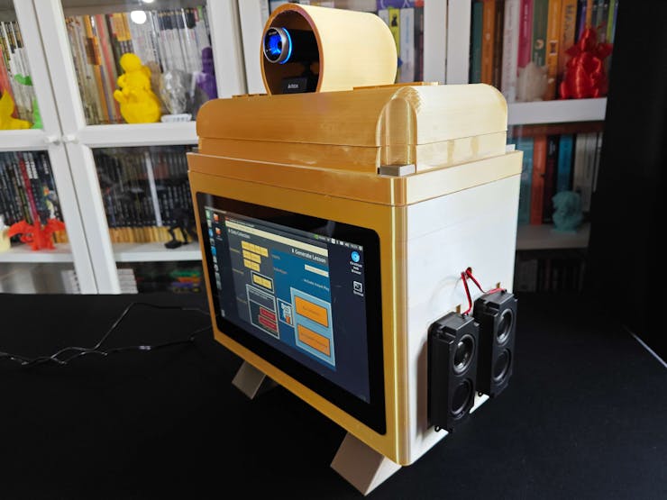 Since I focused on building a feature-rich and accessible AI-driven lab assistant that enhances the distance learning experience with auto-generated lessons, I decided to design a user-friendly and compact case that allows the user to connect the high-quality screen (control panel), USB webcam, and the speakers effortlessly. Since I got inspired by BMO (Adventure Time) while designing my lab assistant's appearance, I decided to place the high-quality touchscreen as the centerpiece. To avoid overexposure to dust and prevent loose wire connections, I added a removable top cover sealed with specially designed triangular screws. Then, I added a slot on the main case in order to attach the CrowVision 11.6'' touchscreen. On the removable top cover, I added a cylindrical camera mount that lets the user position the USB webcam freely while detecting lab equipment and apply proper cable management. Also, I decided to emblazon the NVIDIA logo, the R2-D2 logo, and the lab equipment indicators on both the top cover and the detachable legs to highlight the capabilities of this AI-based lab assistant.