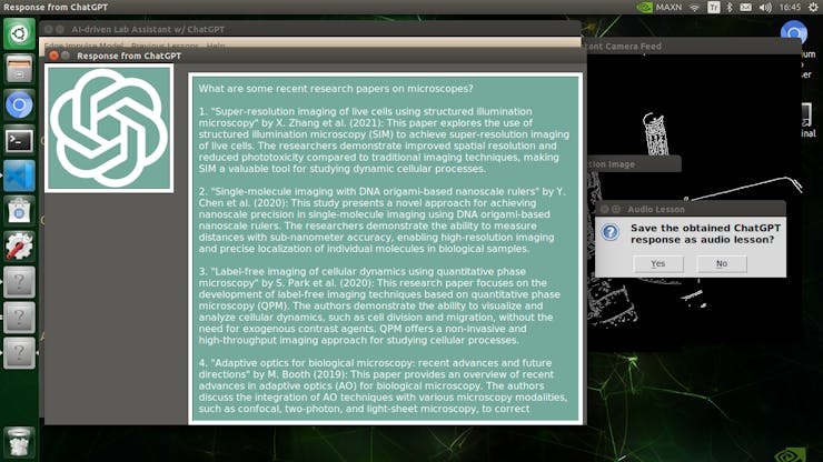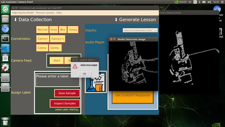 Since I focused on building a full-fledged AI-based lab assistant, after running the object detection model successfully, I decided to employ the OpenAI API to obtain ChatGPT-powered insightful suggestions and guidance as auto-generated lessons so as to inform the user (student) of the detected lab equipment thoroughly. To enable ChatGPT to generate effective lessons not dependent on a single approach, I provided different inquiries (topics) related to the given lab equipment automatically.