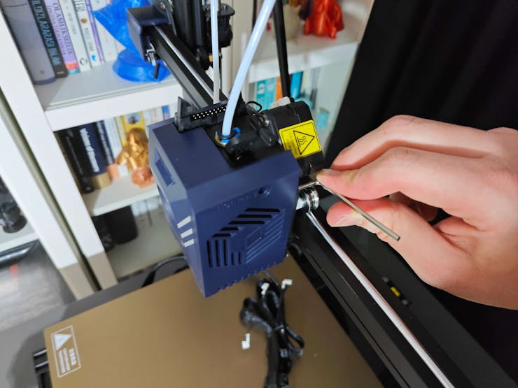 #️⃣ Install the print head and adjust the X-axis belt tensioner. Then, install the touchscreen and the filament runout sensor.