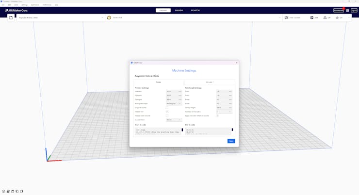 #️⃣ First of all, create a custom printer profile on Cura for Anycubic Kobra 2 Max with given printer settings.