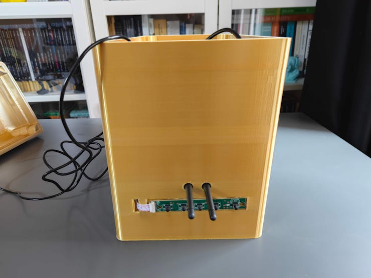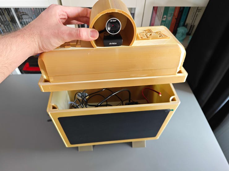 Then, I attached the USB webcam to the cylindrical camera mount on the removable top cover. I fastened the speakers and the OSD adjustment board to their corresponding slots on the main case via a hot glue gun. I placed the AC8265 NIC WiFi/BT antennas on the main case via their assigned slots.