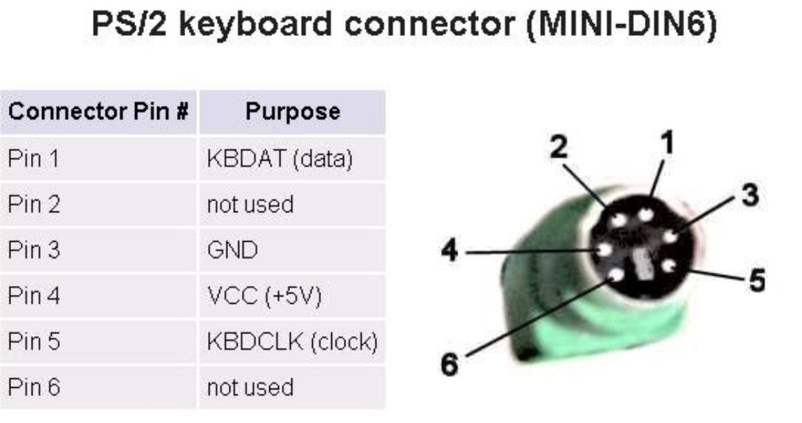 The hardest part of the whole endeavour was determining the pinout of the connector for my PS/2 keyboard. Though there is a great deal of information online, few people bother to say if they are viewing the plug or the socket, the front or the back, or how the pins are numbered. Plus, for good measure, some diagrams are just wrong! For reference, I have a included a couple of known-good examples here.