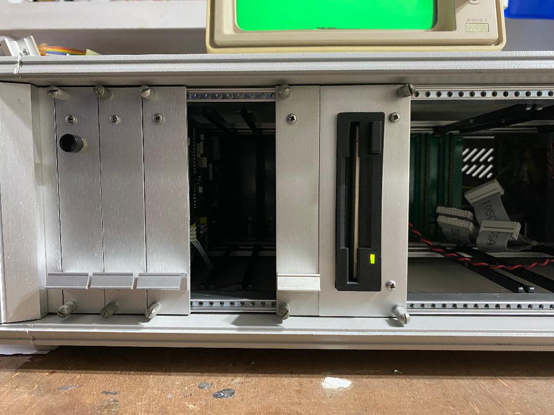 The only (minor) issue in installing the floppy drive, was that the power cable that I fitted to power my Gotek emulator provided only 5V. The Interak floppy drive, being much older, additionally needed 12V. I’m unsure why my system came with no FDD power cables installed, but it was relatively quick to add one, or indeed two. Later, when I came to install the FDD in the rack, I found too that the FDD mounting plate I had comprised a front with a cut-out for a larger drive, but fortunately I had a spare front that I could replace it with. Again an easy task, although the front panels are more robust than you’d expect!