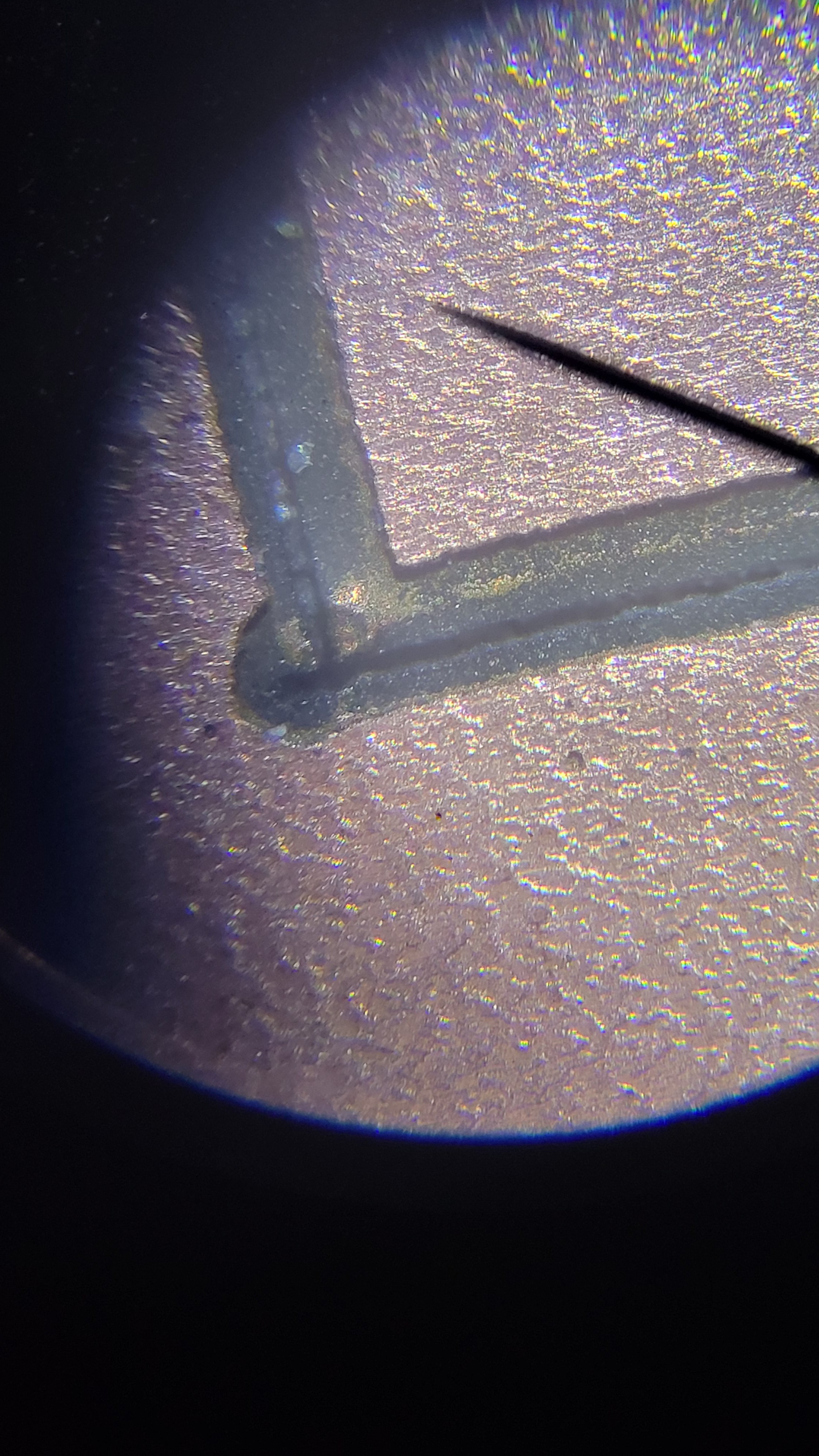 Here example of 3x3mm square using 1W IR laser and drop of ferric chloride under the microscope. (Ferric chloride is already washed away)