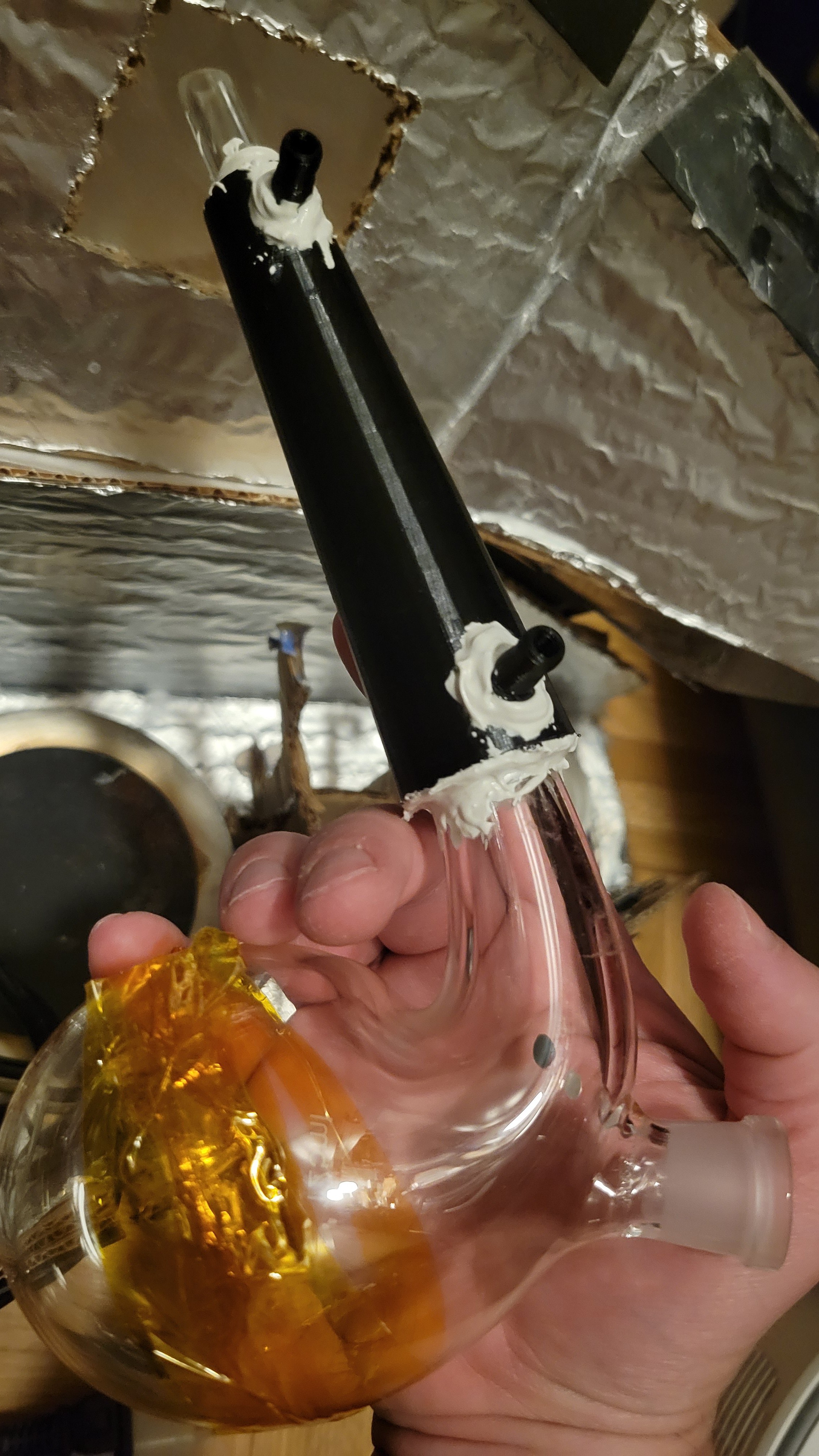 The test was pretty much the same with red fumes now I tried to change the direction of the sensor the temperature jumped to 180°c! Alas! I aimed to high! I throwed waht I've got in the output flask and restarted again, knowingly it already contaminated with some water got few drops their color was more transparent (no yellow)
