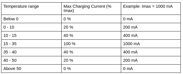 - Temperature-based charging current reduction based on JEITA, cutoff at 0 °C and 50 °C.