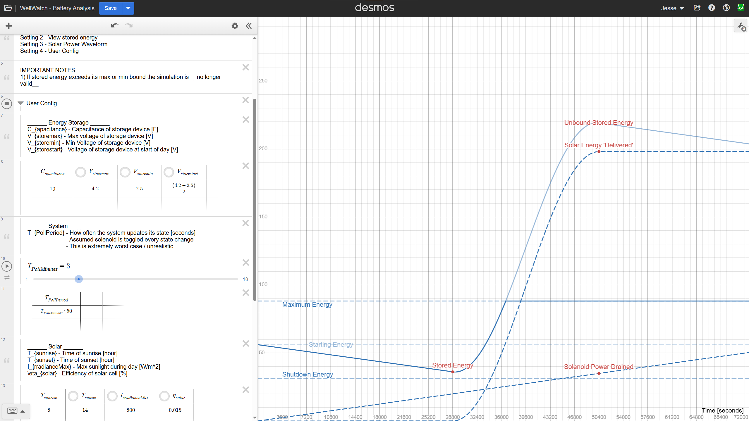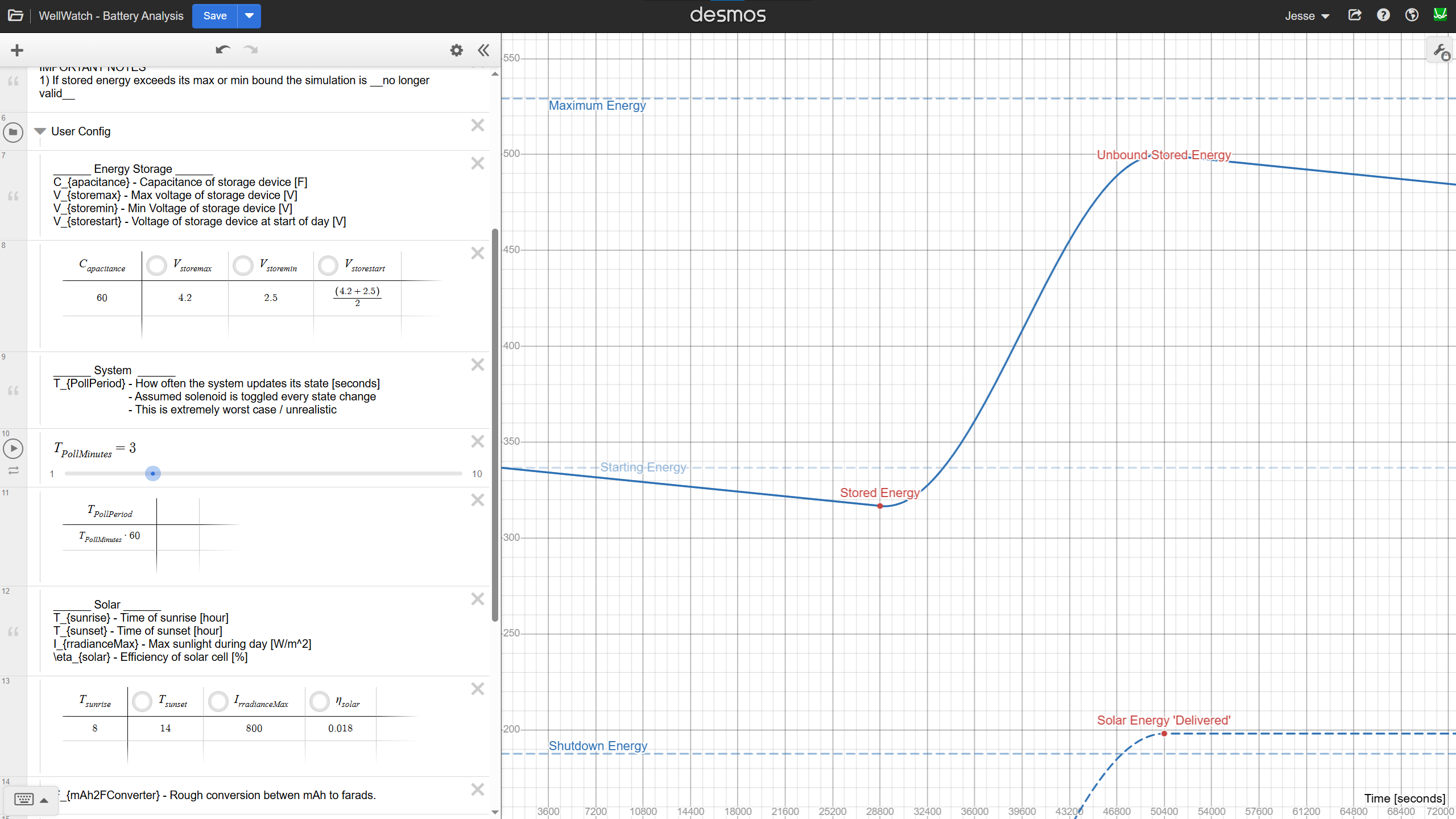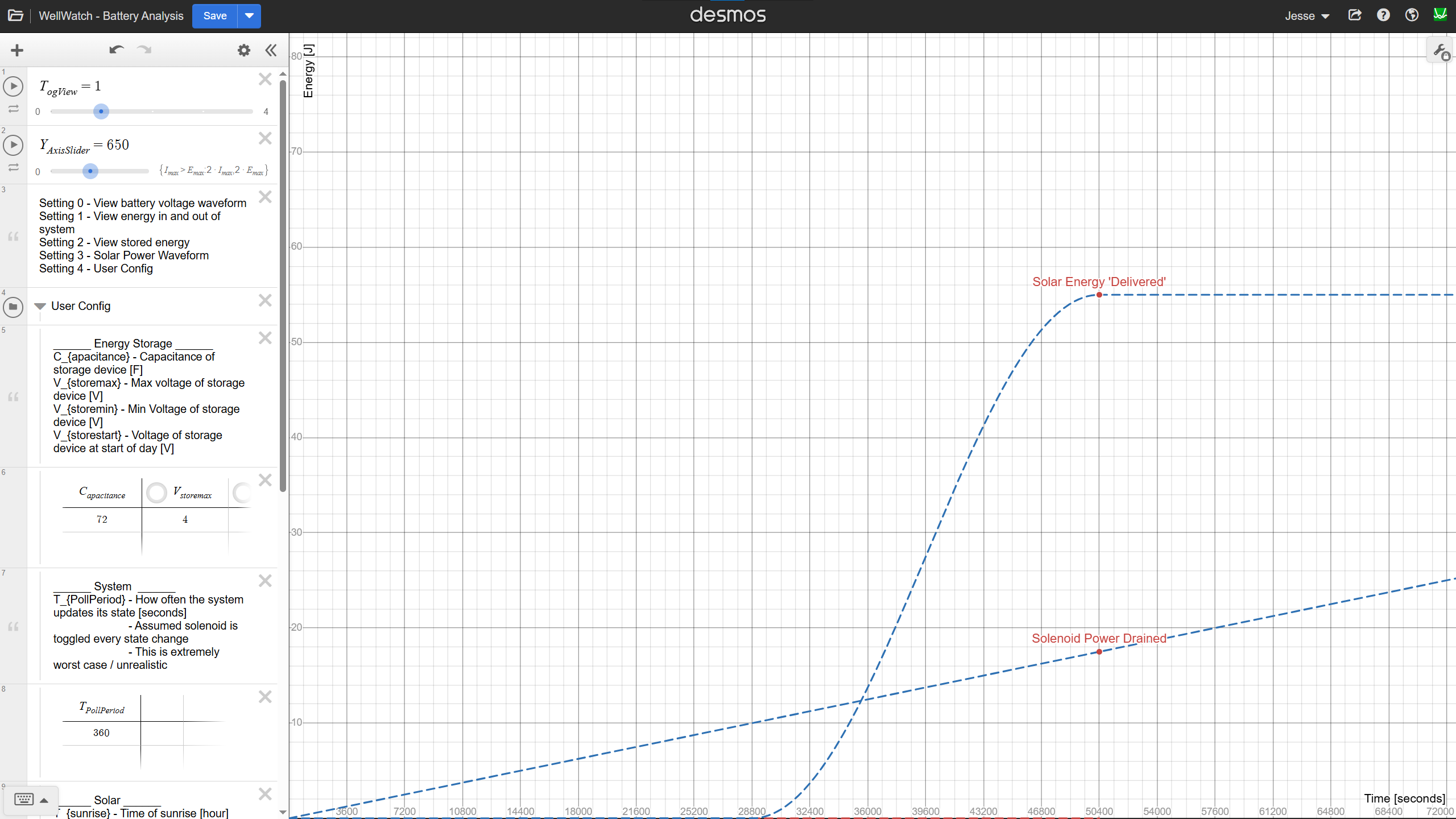 Energy Storage SubsystemWe now have the two key subsystems modeled in the graphs below. Since everything has been defined as a function of time, it’s easy to add or subtract them in the tool. We can also now calculate the energy in our battery as E(t).
