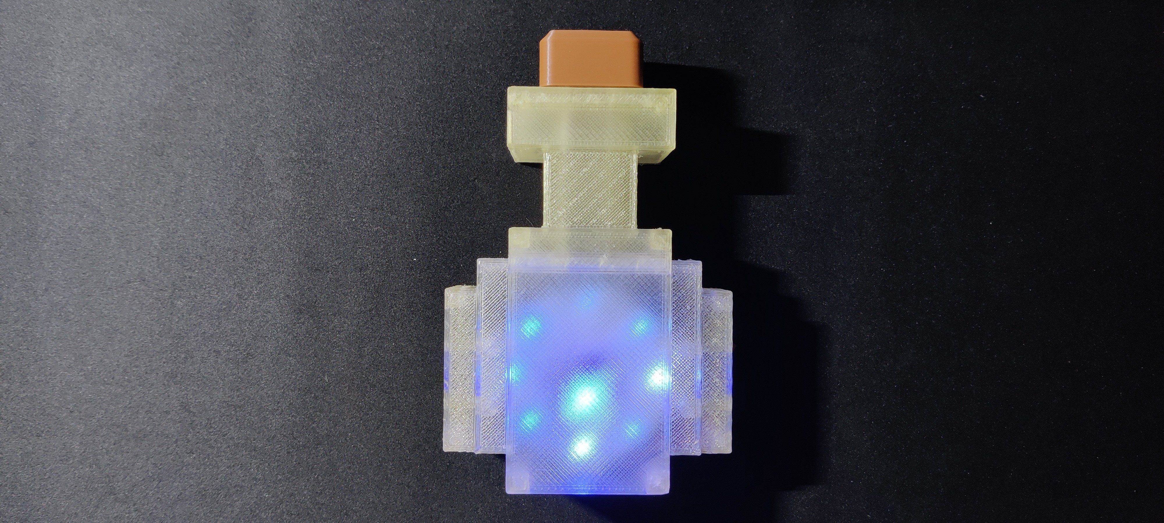 This is the end result of this little build: a full-sized Minecraft potion bottle that, unexpectedly, does not contain any fast speed, invisibility, or high jump potions. Instead, it has a hidden storage space and constantly glows in order to replicate the liquid within.