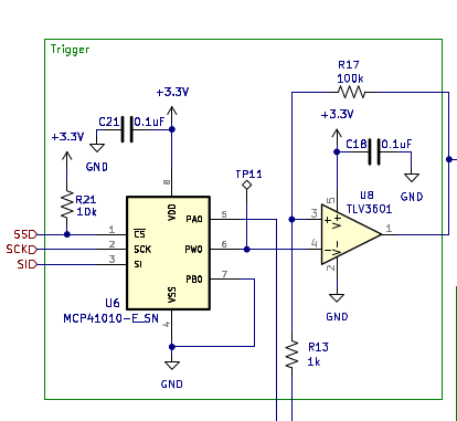The system has two triggering modes, force trigger and normal trigger. Force trigger starts the capture when the trigger is initiated, whereas normal trigger waits for a trigger edge event before starting the capture. With normal trigger mode, the trigger event is recorded at the center of the capture. Normal trigger is achieved with a comparator and a settable trigger voltage as shown below:
