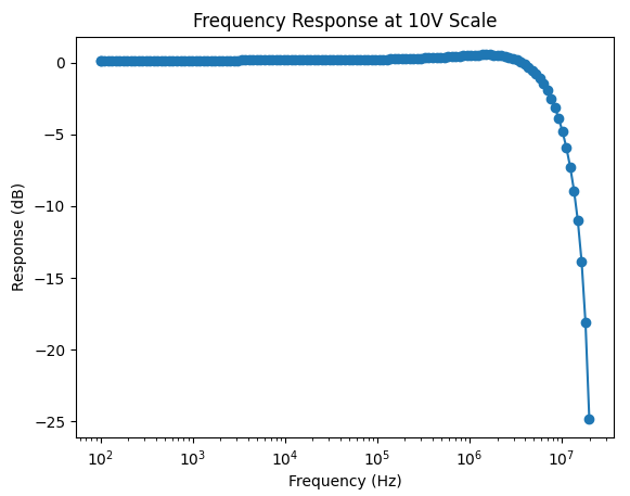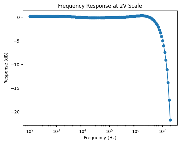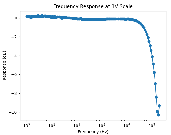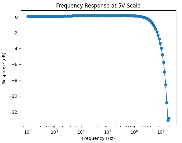 Here is a measured frequency response for each of the ranges. The frequency response is shaped digitally via a 3 point FIR filter. That is, this is the overall system frequency response, not just the analog front end response.
