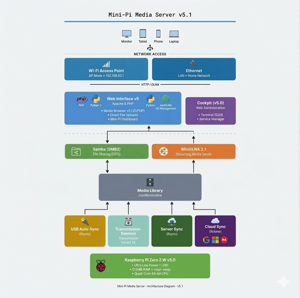 The Mini-Pi Media Server is a low-power, "appliance-style" media ecosystem. It transforms a £15 Raspberry Pi Zero 2W into a high-performance NAS, Torrent box, and DLNA hub drawing less than 2 watts. Whether it’s for a home network, a hotel room, or a car full of kids with tablets, Mini-Pi delivers a seamless streaming experience.
