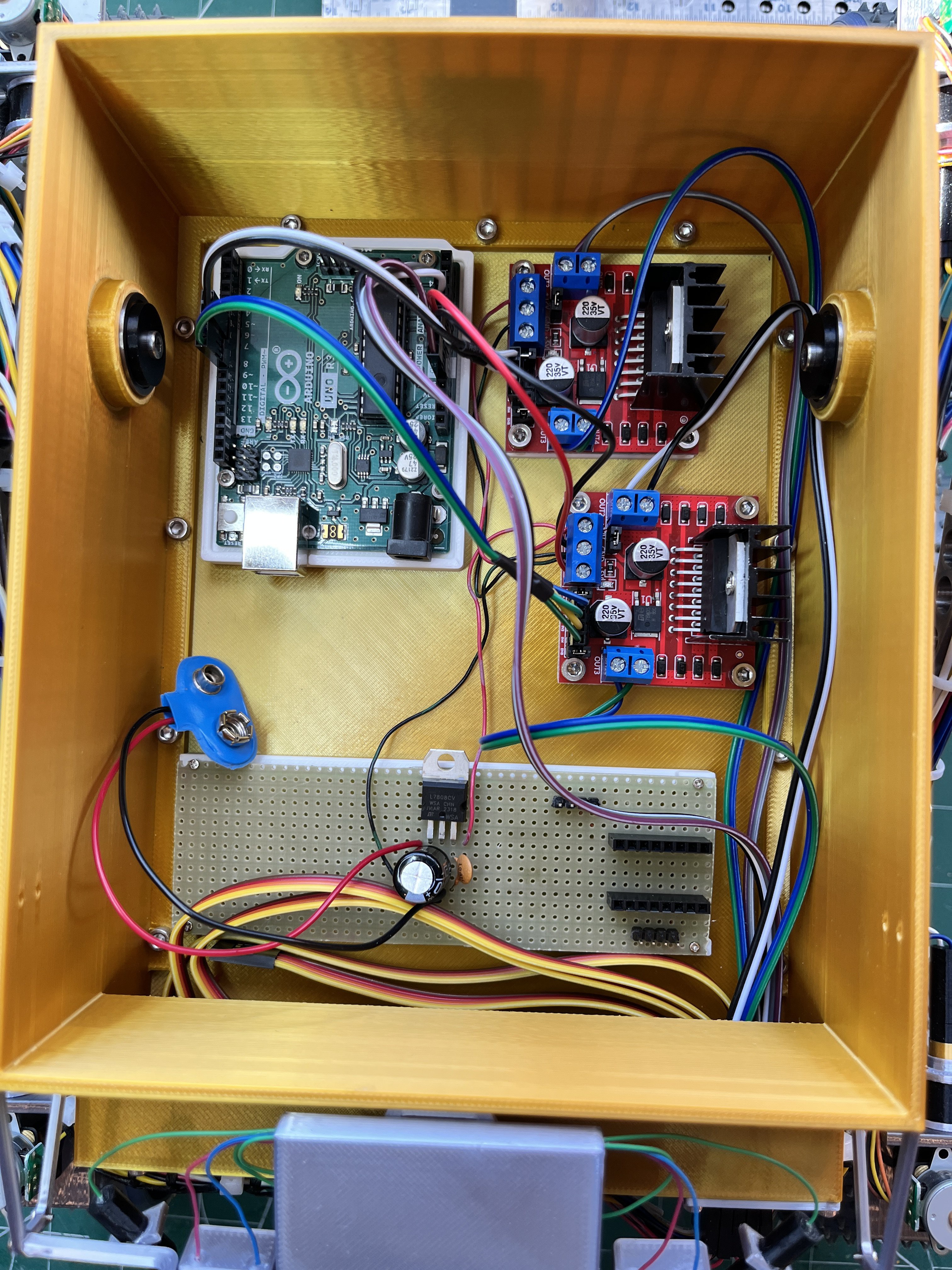 The real rover has six driven wheels. For simplicity only the four corner wheels will be driven and the two middle wheels will rotate freely. The steering is accomplished using four servos, one at each corner wheel. The go to steering maneuver for this rover seems to be turn the four corner wheels in and rotate in place. All of these motors will need motor drivers. For this I chose the L298N motor controller modules requiring 4 digital output pins. One module can drive two DC motors. Each stepper motor is driven by an A4988 stepper motor driver requiring 2 digital output pins. The directional input is via a joystick requiring 2 analog inputs. The total input/output count is 12 digital output pins and 2 analog input pins. A single Arduino Uno should work for this project.