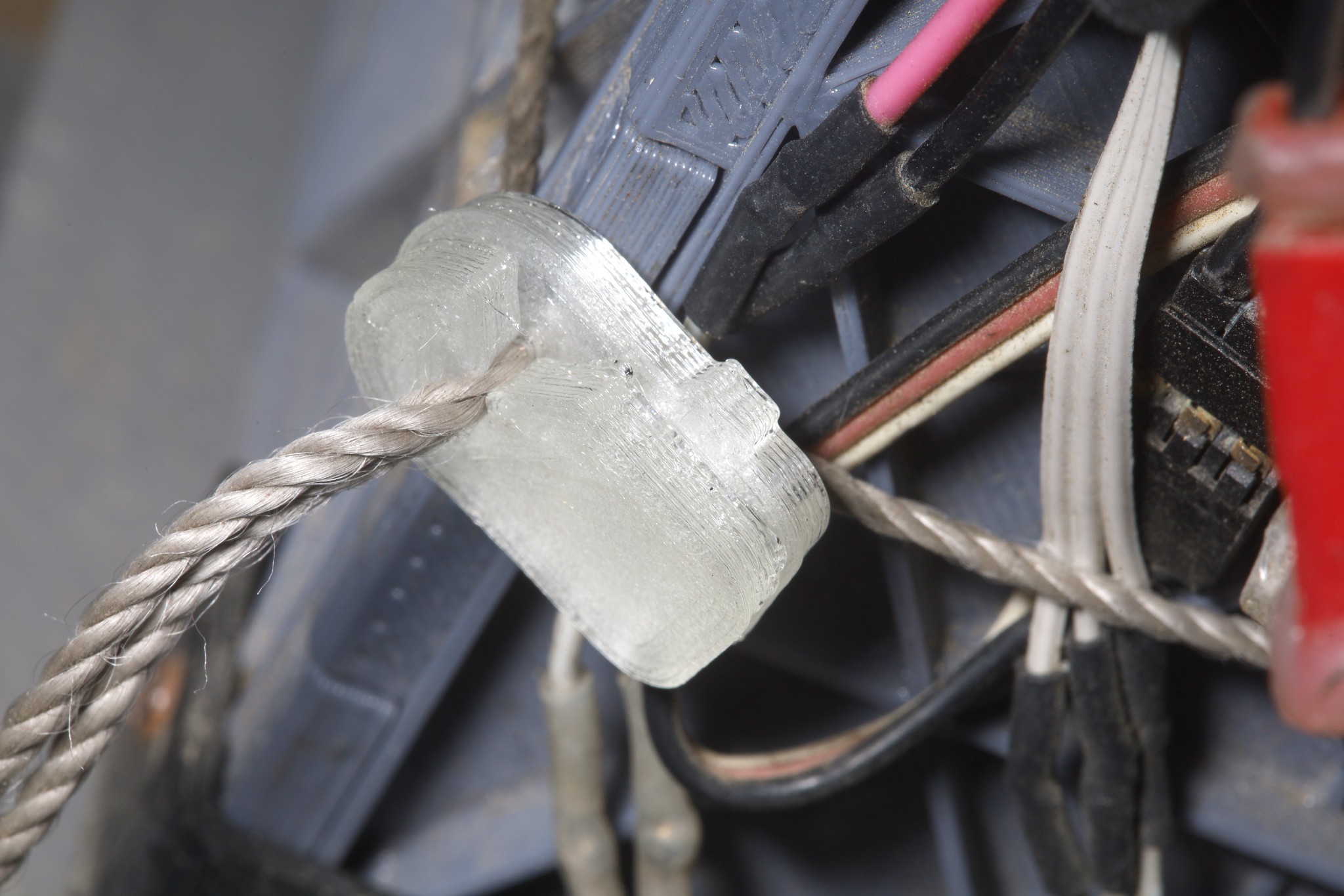 Disappointment with spring loaded cord locks got lions thinking more about a permanent system. Previous ideas centered on passing string through a TPU cylinder that was welded closed. It would provide enough compression to keep the string in place while still allowing it to move with enough force.