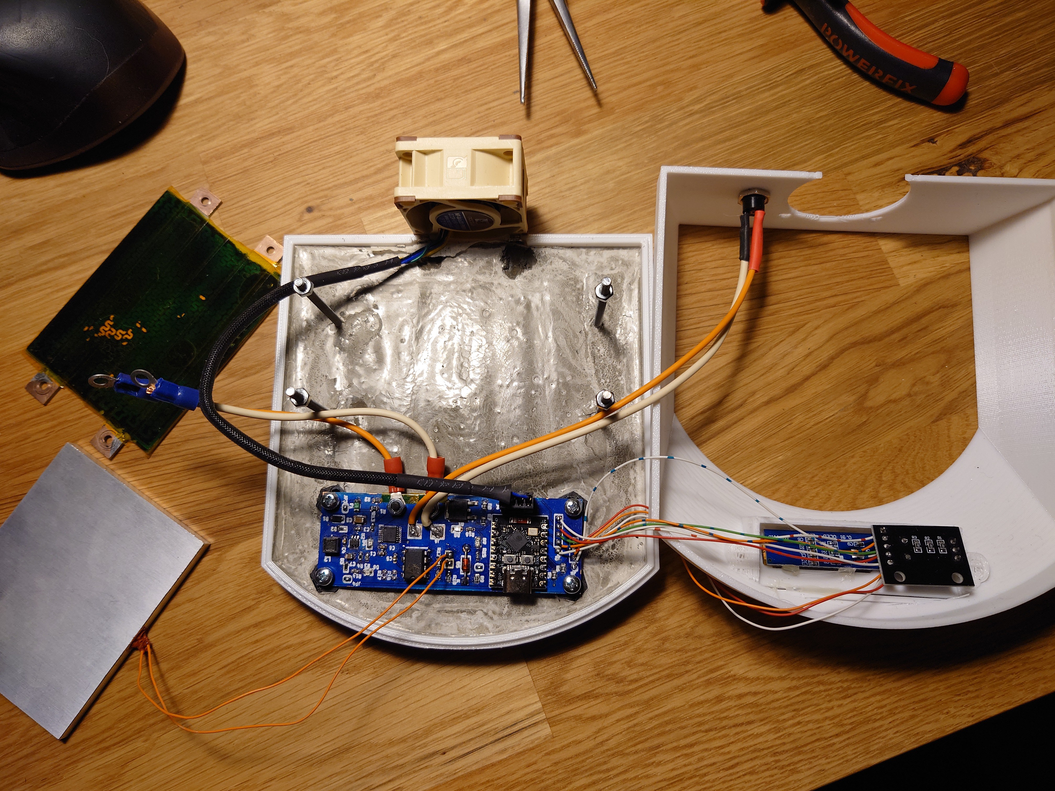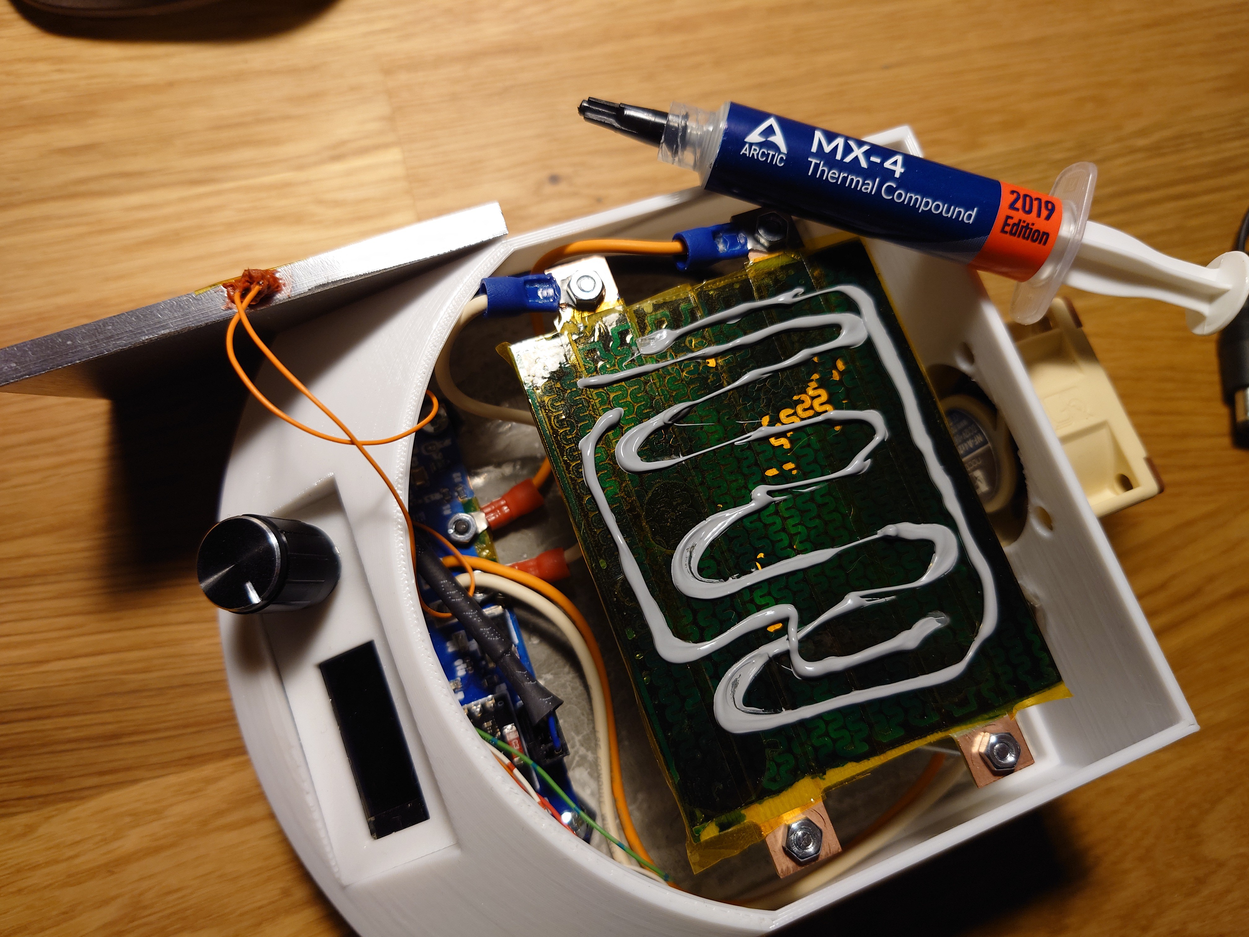 I went through the trouble of coating the board with soldermask, but that turned out to be a waste. Few heating cycles later, the soldermask started to chip off. To be on the safe side, the board got a layer of kapton tape before assembly to aid the electrical insulation. To help distribute the heat more evenly, I slapped a slab of aluminum on top of the heater - right after applying a nice coat of thermal paste. The thermal past specifies continuous use temperature of 150ºC so I'm curious to see long term effect.