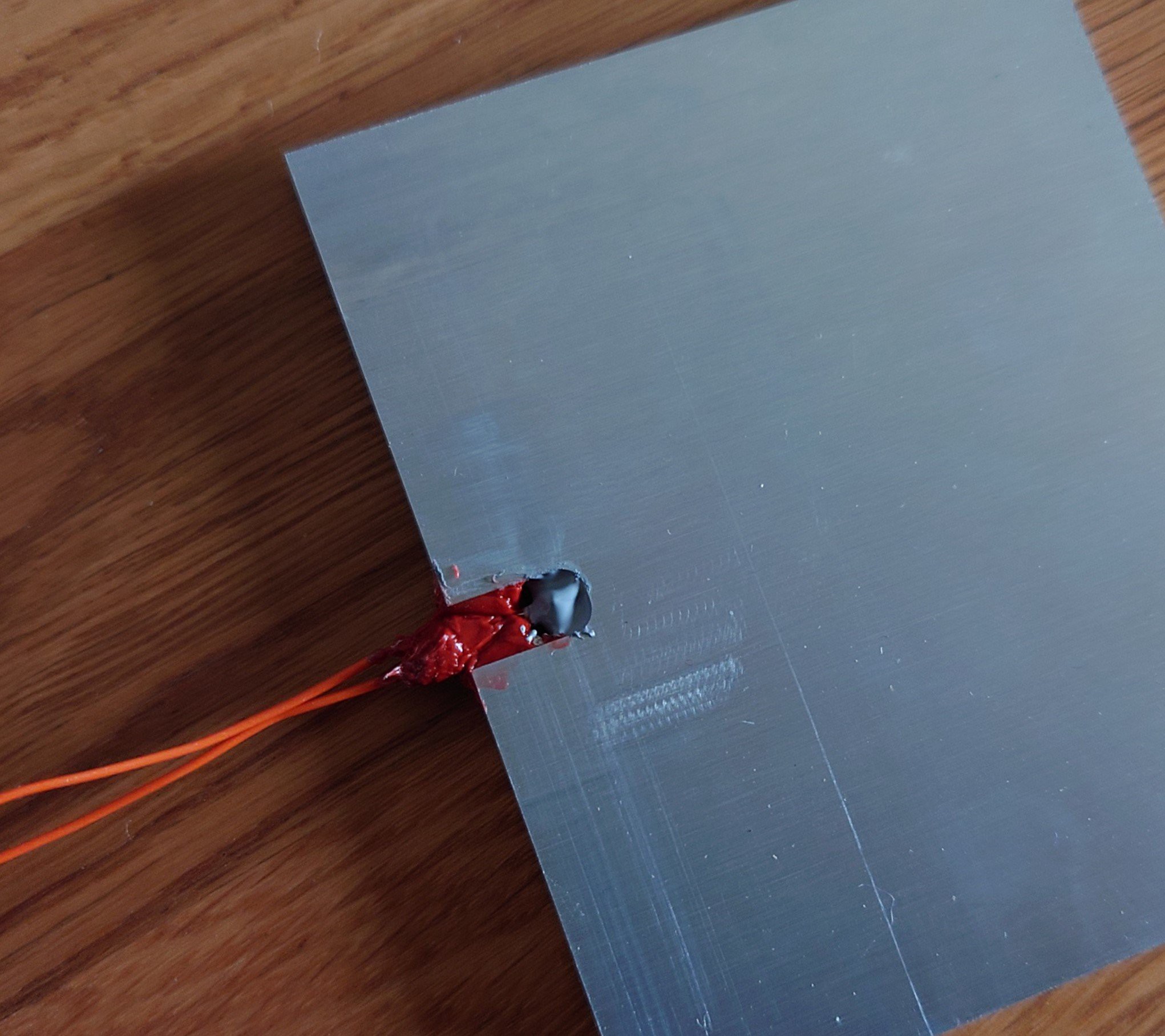 Aluminum plate is milled from a 5mm plate with a small slot for a PT100 temperature sensor, and the temperature sensor is fixed with the help of some high-temperature silicon, while the tip of the sensor is brought in contact with the aluminum, and the whole connection again bathed in thermal paste.