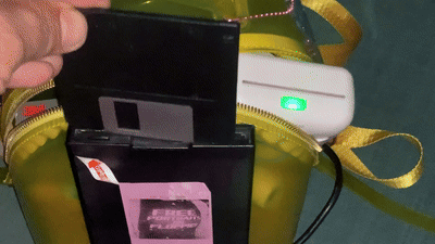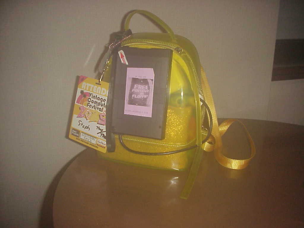 I was emotionally preparing to shelve the project until next year when, around breakfast time the day before the event, I impulsively tried attaching a floppy disk reader to the outside of a backpack using heavy-duty double-sided adhesive, just to see how it looked: