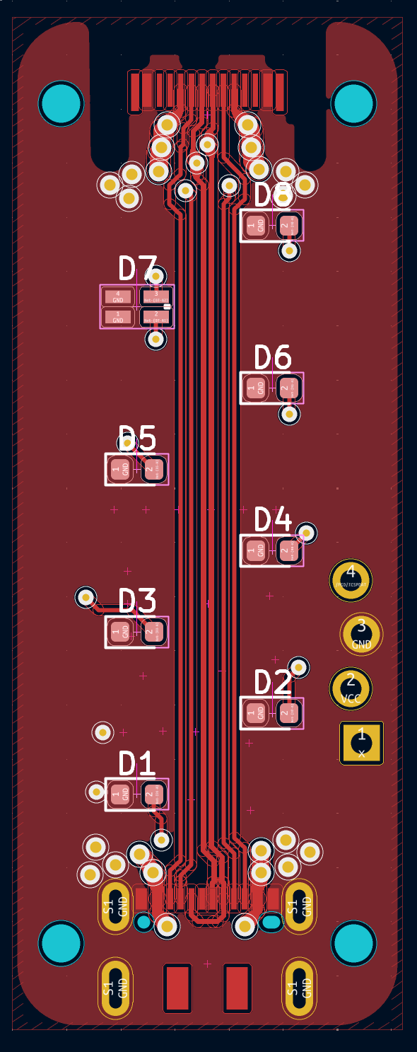 Next, we decided to change the shape of the indicators from rectangular to circular and arrange them in a zigzag pattern. Circular indicators would mean that they could be placed closer to each other at a 45-degree angle, this would also decrease light bleed. Both changes would not only result in a great reduction in length but as well much better look for the device. As mentioned in the previous point that passthrough signals would no longer have a dedicated PCB layer, but thanks to placing indicators in a zigzag this wouldn't be necessary! Both passthrough signal LEDs can be on the same layer while the signals retain their straight and shortest path from receptacle to plug (as shown in the figure below). The stack-up of the "main" PCB was changed to Signal, Ground, Power, Signal (from top to bottom).Zigzag placement of indicators allows the high-speed signal to pass straight though the middle