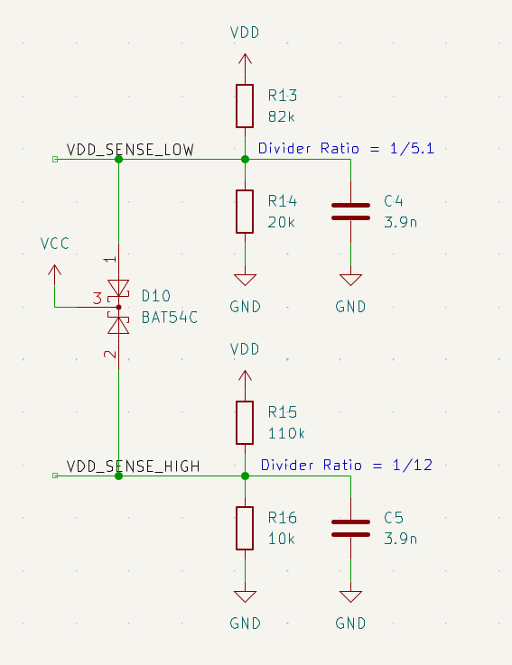 Another problem we had to address was the fact that increasing the voltage measurement range from 22 V to 51 V would result in degraded measurement resolution from 22 mV to about 50 mV (when the ideal is about 25 mV). To avoid this, we decided to split the voltage range into low (from 0 to 22 V) and high (from 22 V to 51 V) range and use different ADC pins connected to separate voltage dividers for the two ranges. This would work because the minimum voltage deviation higher voltage will be used to detect is 1.4V (5% of 28V), as opposed to 0.25V for the lower range.A major downside of this approach was that voltage on the low range ADC pin would exceed VCC voltage when the input voltage (VDD in the above figure) is higher than 25 V, to mitigate this, we tied both the pins to VCC using a Schottky diode which would limit the voltage on the ADC pins to rise to a maximum of 5.4 V (approx.), we further calculated input current in those pins in case of an open-circuit diode failure and made sure that it was well within the maximum acceptable values of the input current given in the ATtiny's datasheet. Of course, implementing the two-range solution would require the software to be slightly more complicated, but it is well worth it.