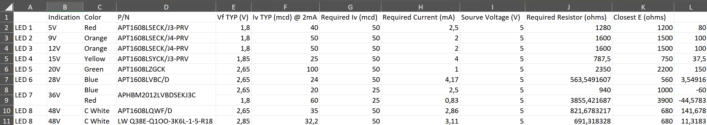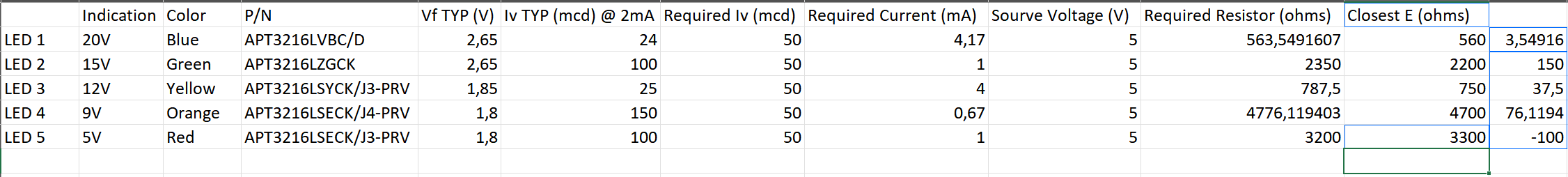 The table below presents the calculated current-limiting resistor values required to achieve uniform brightness across all indicators, targeting a light intensity of 50 mcd for each LED. It is to be noted that datasheets of red and orange LEDs had two ambiguous values of typical Intensity in them, we weren't sure which one to use so we went with the higher one, this would have consequence later.