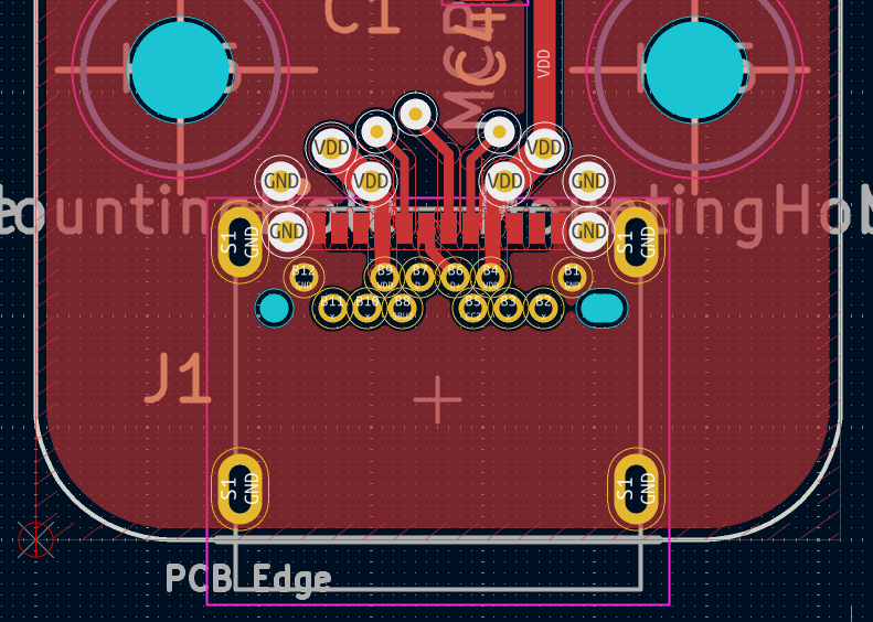 One of the first things we noticed was how well all PCBs fit together with plenty of margin between the components and cutout edges. Furthermore, the PCB with the cutouts was sturdy, even after applying quite some force by hand it didn't come anywhere close to breaking. This alleviated all of our concerns regarding the mechanical aspect of our design and we realized that the cutouts didn't need to be any larger than the area under component courtyards (according to the footprint standards), and that we have a lot of room to play with; the minimum width of the PCB edges, which was quite generous.
