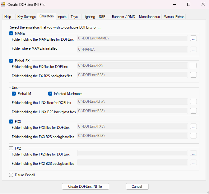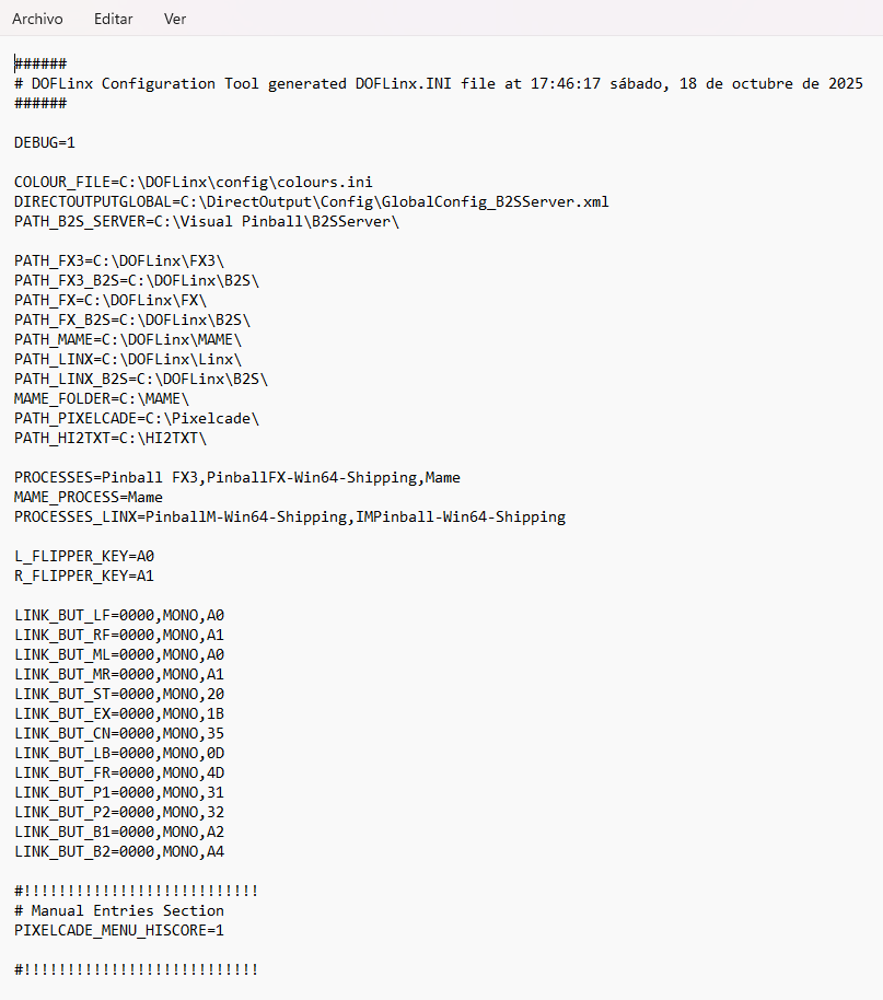 <command>"C:\RetroBat\plugins\launch_mame_direct.bat" %ROM%</command>DOFLinx es un programa de utilidad diseñado para funcionar con DOF (Direct Output Framework) R3 (a partir de la versión 6.20, esta es la versión R3++ de DOF) para proporcionar funcionalidad adicional a los emuladores de pinball que no la implementan directamente. Inicialmente, solo añadía retroalimentación háptica a los flippers de Pinball FX2 y se llamaba DOFFX2.