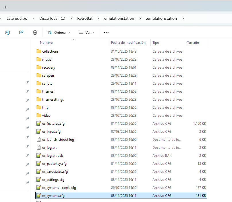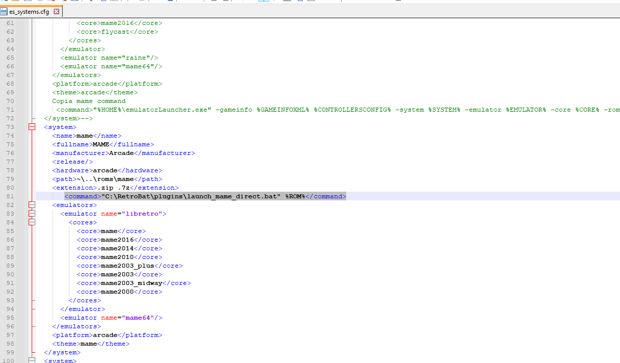 Luego tenemos que editar es_systems.cfg y sustituir el command de mame por uno nuevo que apunte al .bat creado