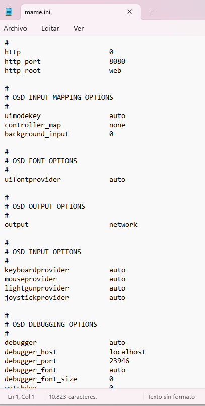 Una vez instalado MAME, debes modificar el archivo MAME.INI para habilitar la comunicación TCP con MAME. La sección que debes modificar se encuentra en “OSD SOUTPUT OPTIONS”. Configura la salida en “network”. Esto es fundamental; sin esta configuración, nada funcionará.