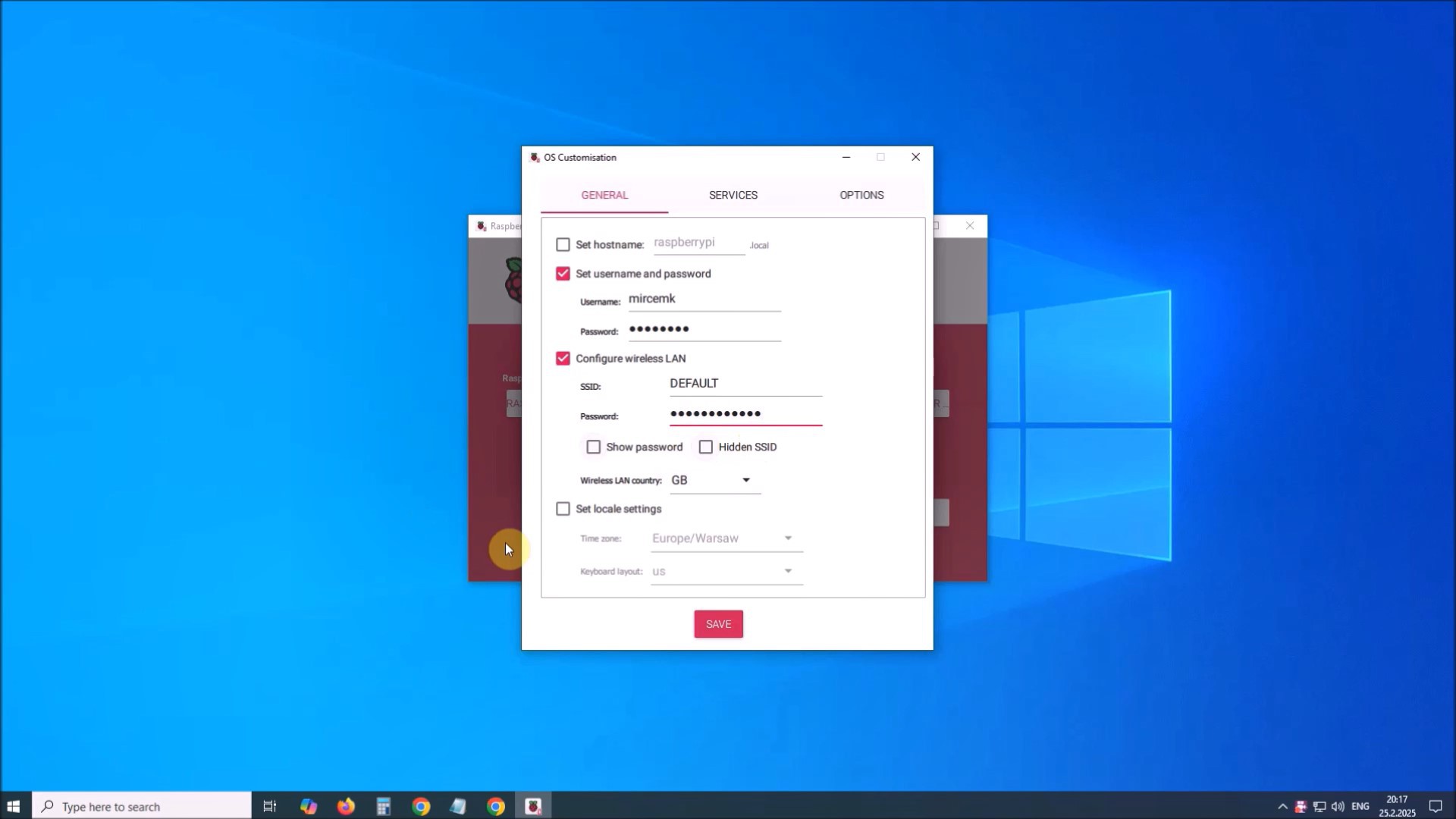 First, we need to download the image from the OpenWebRX+website. Then, we need to download the Raspberry PI Imager application, which will be used to install the image on an SD card. First we select the device - in my case Raspberry Pi 5, then we select the storage on which the image will be installed, and finally we select the operating system, selecting the Use Custom option, and select the image that we downloaded previously from the given address. Now it is desirable to perform some custom OS settings. Here we enter username and password, wireless LAN credentials and locale settings.