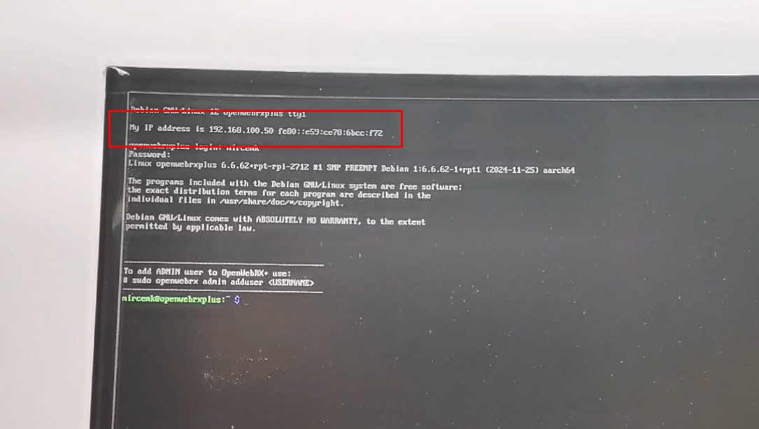 Now we start the operating system for the first time, during which it will reboot several times. We need to log in with the previously defined username and password. Now we need to create an ADMIN user for the OpenWebRX software according to the given instructions. At the top of the screen, you can see the IP address that this device has obtained on the local network.