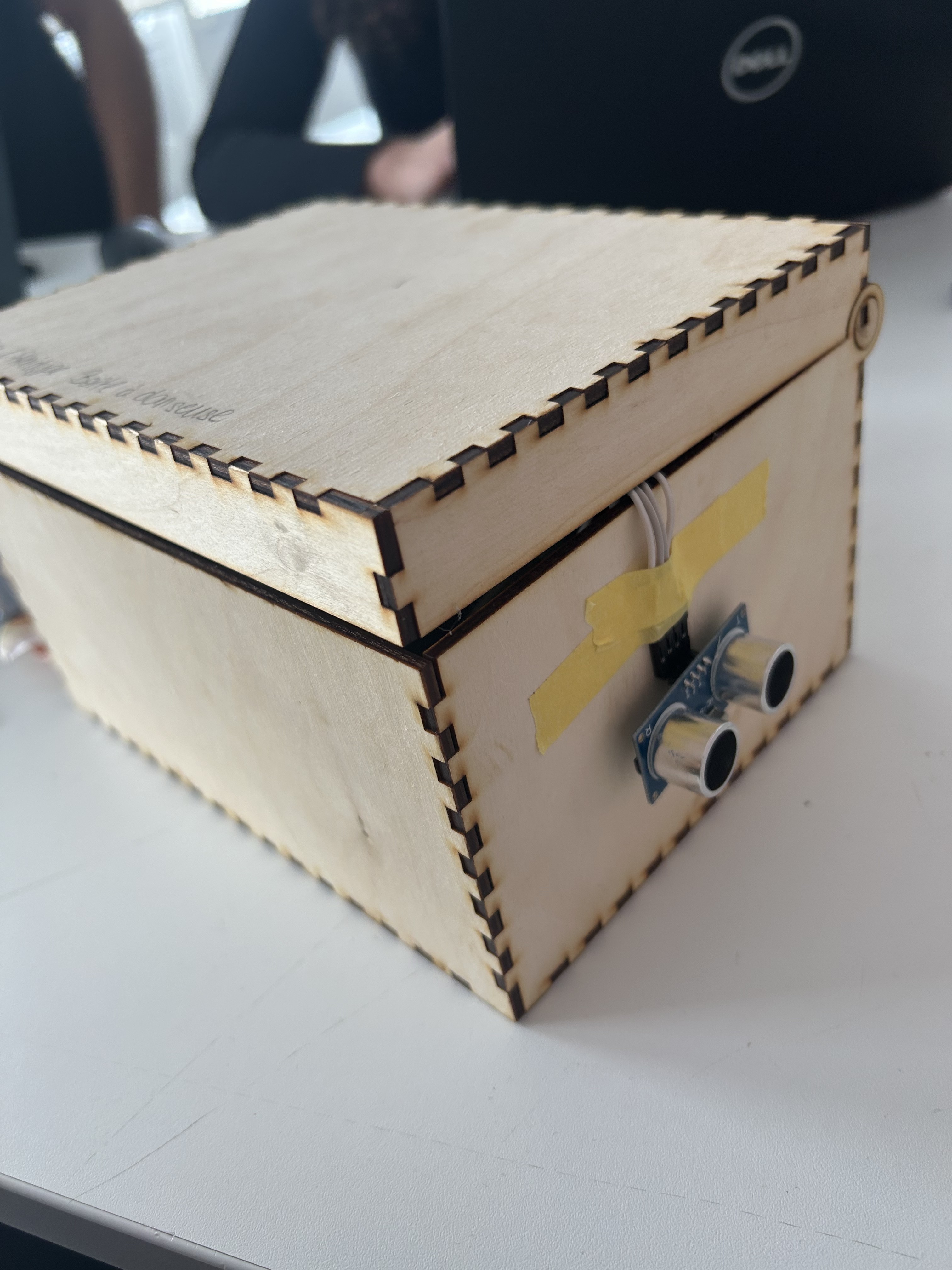 Our two mechanisms have been finalized so it is time to assembly our futur project to make a prototype before the final desing. We take a cardboard box for our prototype with the spinning servo for the dancor in the middle of the box and the captor on the right side of the box to easily open it.