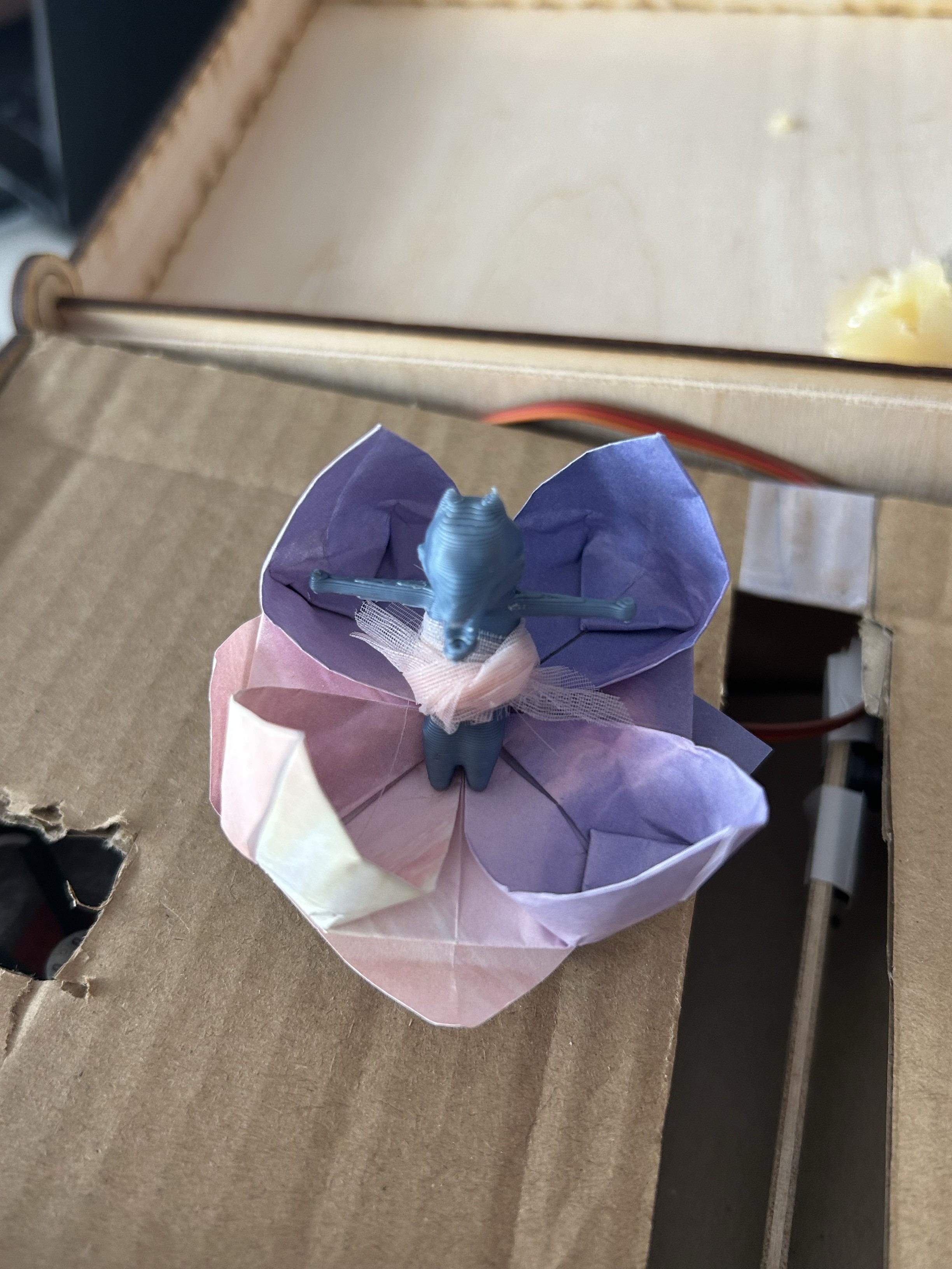 All was done so we show our final project to have reviews, and the teachers told us that we will have a better grade if the dancor was spinning undirectly connected to the servo. so i cut gears on wooden board like for the box and fix one on the servo and put the another one next to it to make the rotation. we succeded without troubles and we made another design still with origami. I make it more aerial.