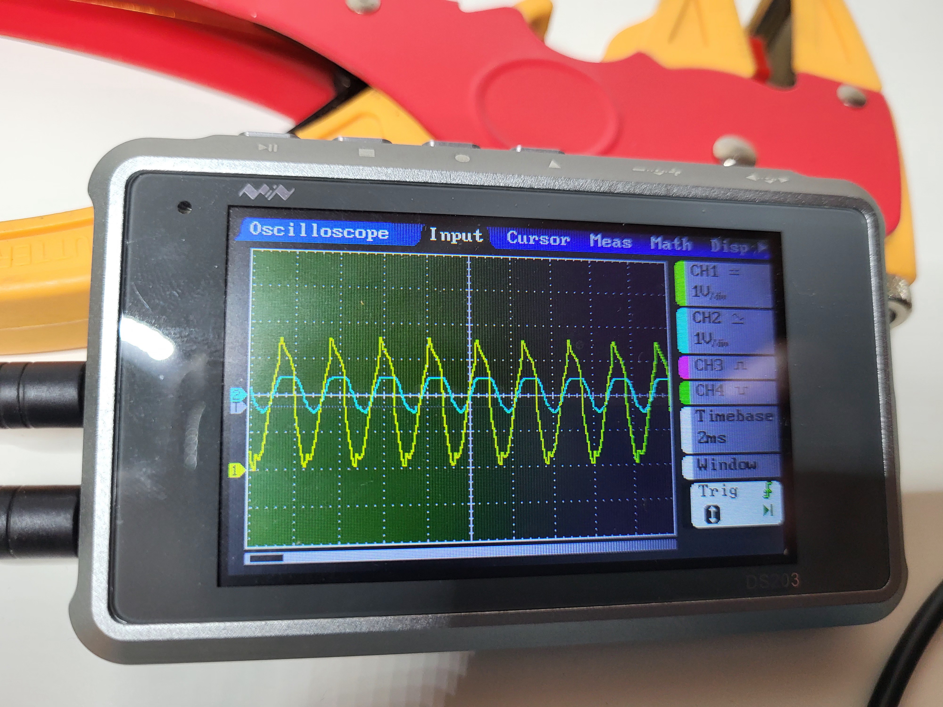 Notice the sharp edges at the low and high spots of the Yellow trace, as soon as the blue trace (the driving coil) either Turns on or the first step-off. (I don't know why it does the first step down. Well, I am not an Electrical Engineer...)