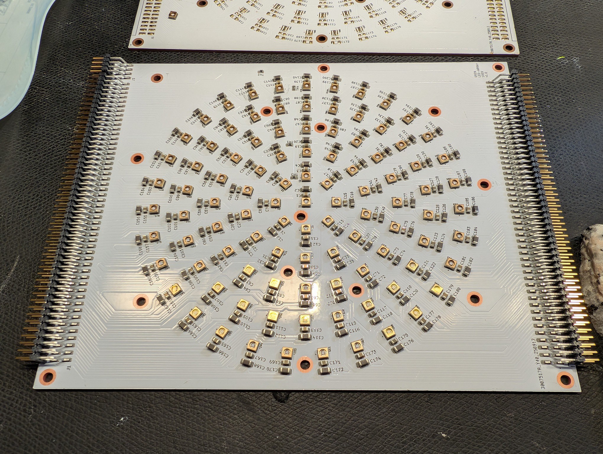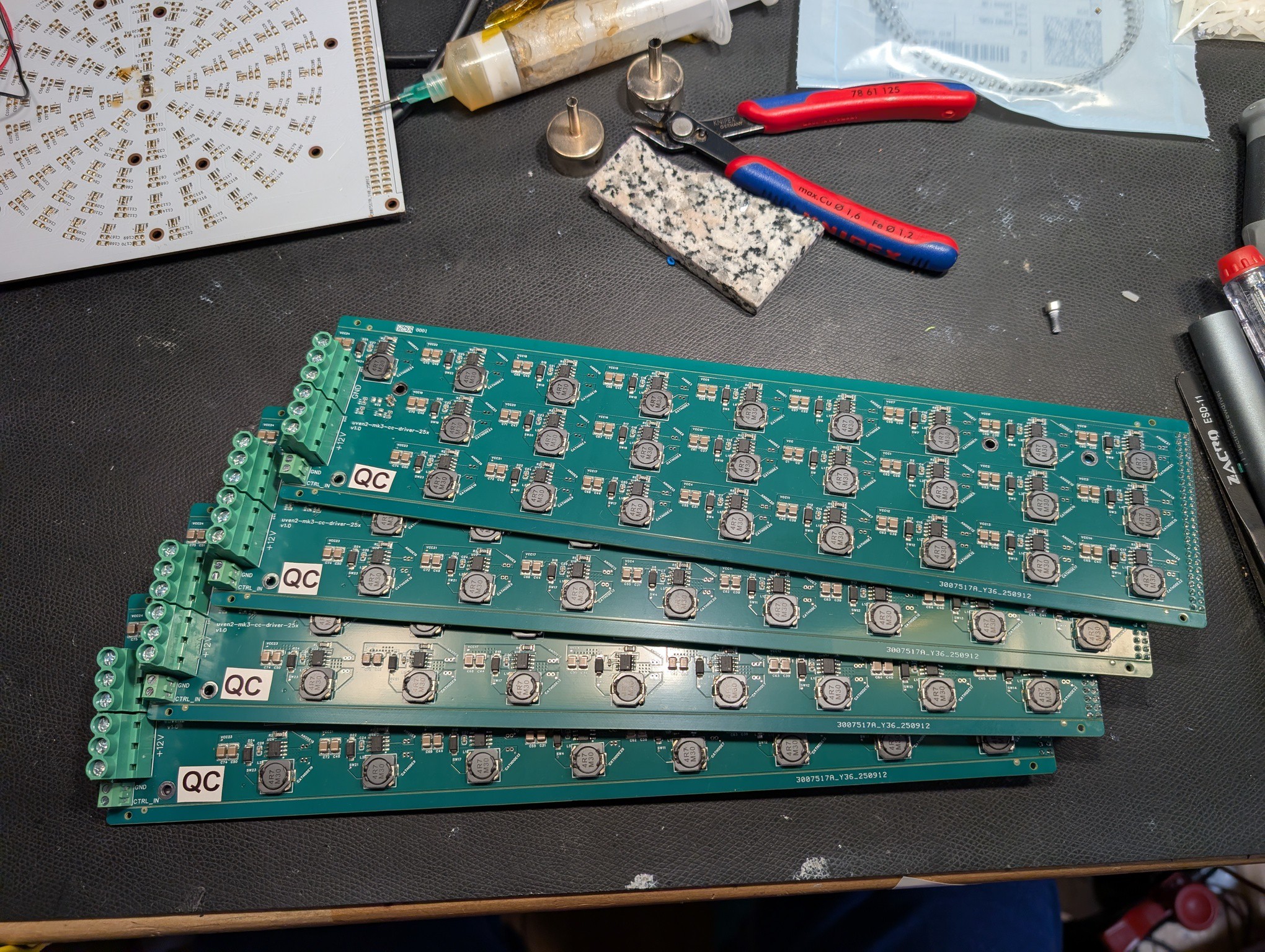 For each LED panel with 100 LEDs we plug 2 of these 25x driver boards on either side of the panel. The full lamp is starting to take form: