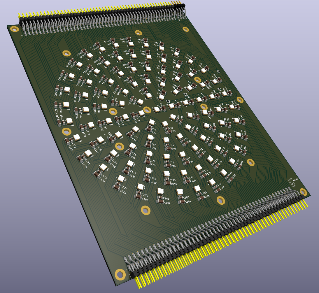 Next I designed the LED panel. We chose 100x LEDs for this version. The spacing is as uniform as possible. Unfortunately EasyEDA doesn't seem to have any way of positioning components in a programmatic way, so for this PCB I'm using KiCAD again. KiCAD has a python scripting console and I used the following script to place all the components automatically.
