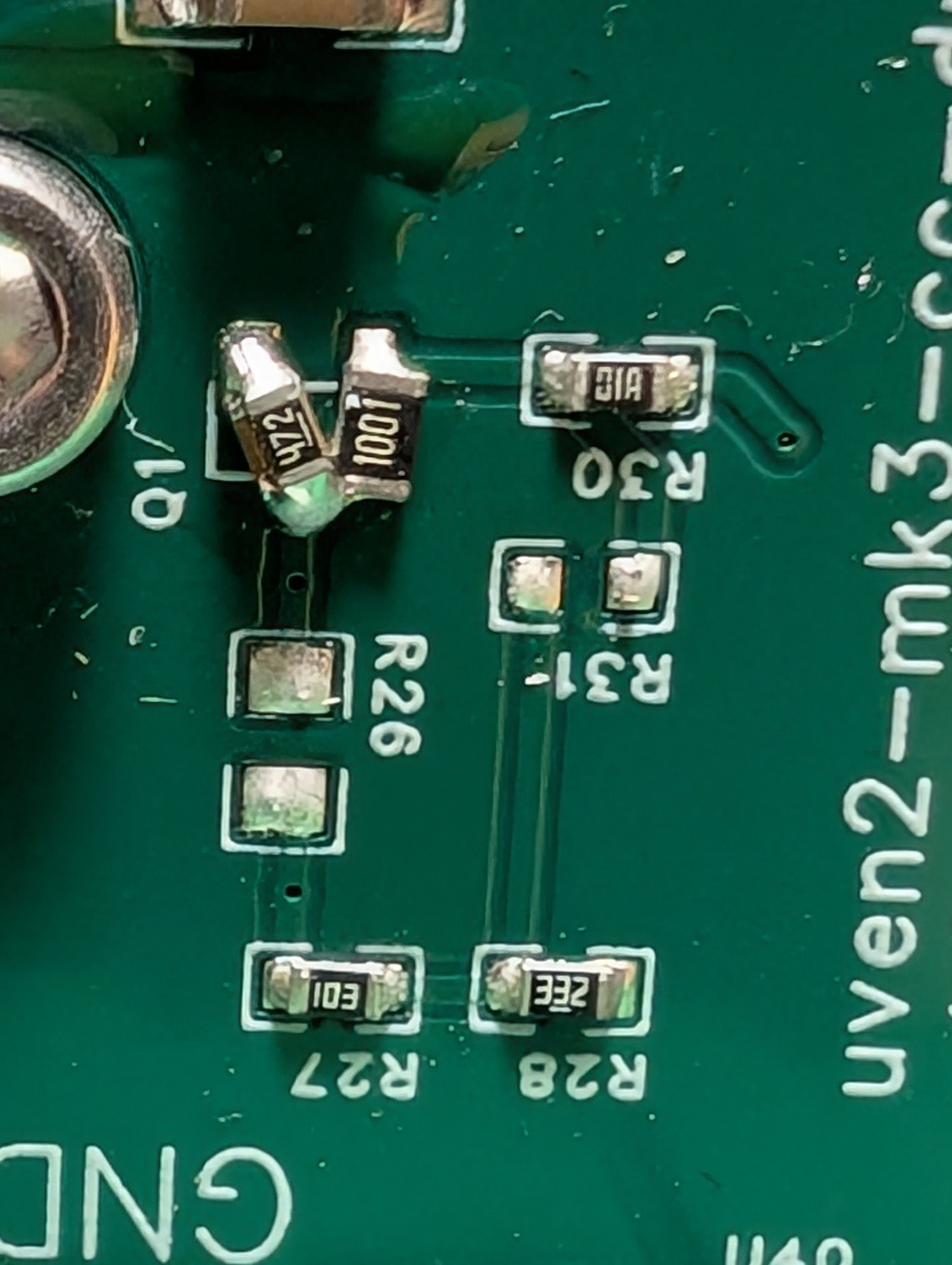 While the LED is pretty hot on the top, the copper base PCB together with the heat sink seem to cool the LED sufficiently. But the driver got very hot. Specifically the current sense resistor. And I noticed I had made a mistake and assembled a 250mW rated resistor. Should be at least 1W..