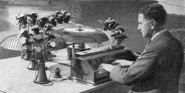 This is what Matthews’ Luminaphone circuit looked like. Each key turned on an incandescent bulb that was directed at a particular ring in a metal disc, which was spinning at 400 RPMs. Each ring had a pattern of holes made in it. Light that made it through the holes in the disc fell on a selenium cell (an early photoresistor), which altered the amount of current that flowed through it, and the transformer it was in series with. This transformer removed any DC components from the signal, leaving just the light modulated signal on the other side of the transformer. This was fed into some amplifiers before it reached a speaker.