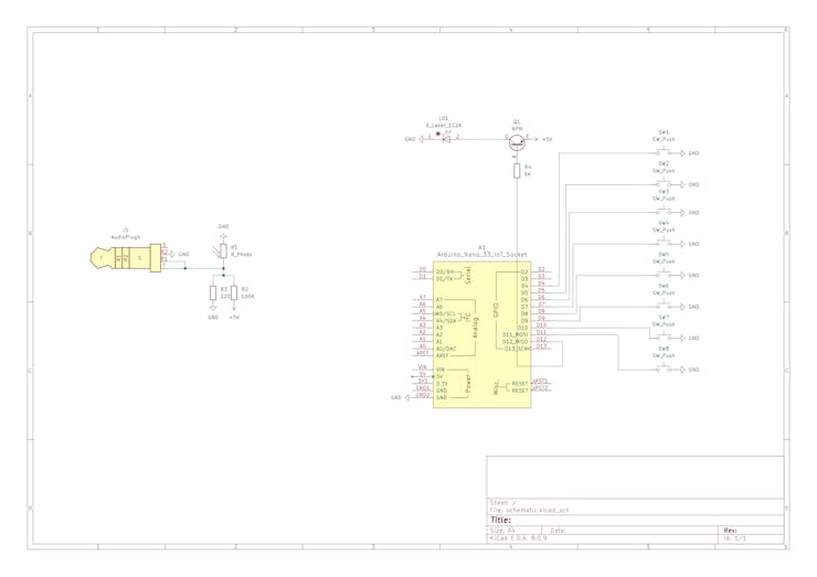 GPIO pins are rapidly switched on and off in a pattern I define when buttons are pressed. That switches a transistor that controls the current flowing through the laser. The laser shines on a photoresistor, which turns the light into an electrical signal that is played through a speaker.