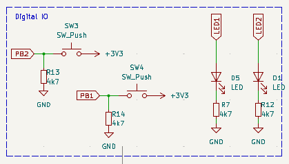 Power is supplied via the 5 V line from the USB port. A low-dropout (LDO) voltage regulator then steps this down to 3.3 V, which powers the microcontroller and all other onboard components.