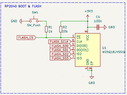 For program storage, the RP2040 relies on an external flash memory connected via a QSPI interface. In this design, we’ve used the W25Q16, a 16 Mbit (2 MB) flash chip that offers fast and reliable access to firmware and data.