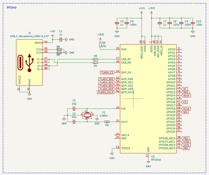 To function properly, the RP2040 requires a 12 MHz external crystal oscillator for its system clock, along with several decoupling capacitors to ensure stable power delivery.